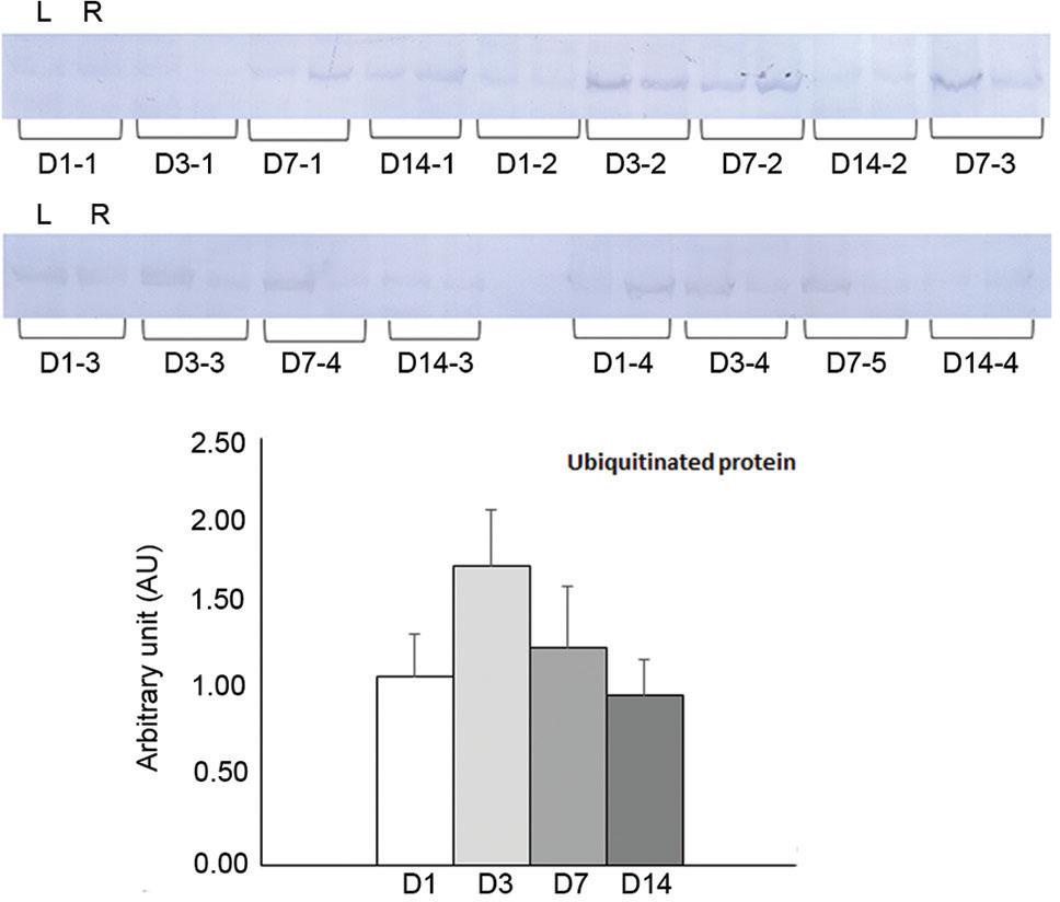 Ubiquitinated protein in the right (R) and left (L) L4-6 dorsal root ganglia of rats sacrificed at day 1 (D1), day 3 (D3), day 7 (D7), and day 14 (D14) after nerve crush (n = 7 for each time point). Representative immunoblots are shown above. The bar chart demonstrates the left/right ratio at each time point. Error bars represent SEM.