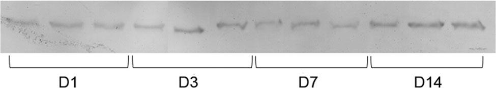 Representative immunoblot of dorsal root ganglia from rats sacrificed at day 1 (D1), day 3 (D3), day 7 (D7), and day 14 (D14) after nerve crush, probed for beta-actin.