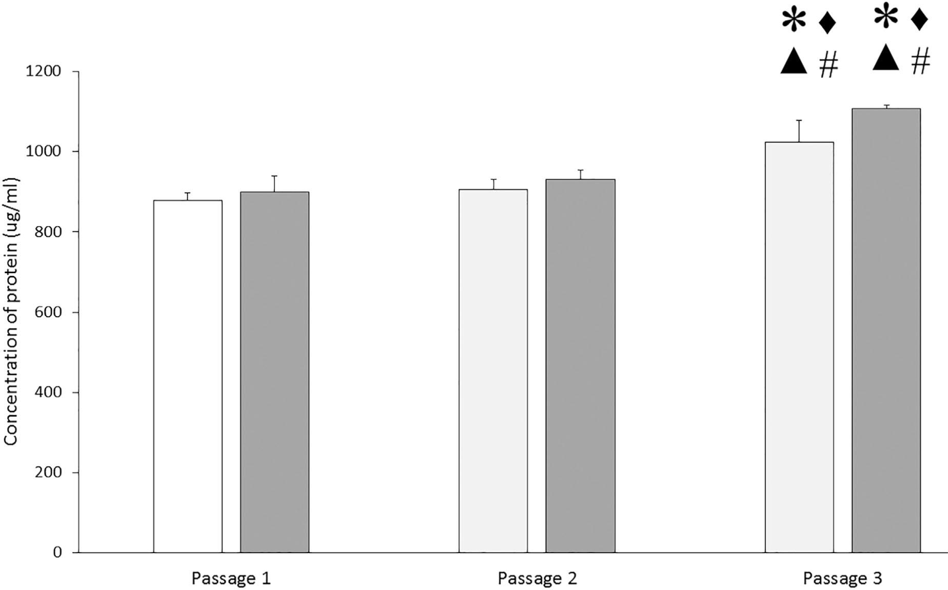 Protein concentrations for iCCM for every passage at different collection time points. There are no significant differences in the passage 3 protein concentration between 48 h (unfilled bars) (1023.22 ± 55.85 μg/ml) and 72 h (gray bars) (1108.64 ± 7.82 μg/ml). *significant differences with P1 (48 h), ▴ significant differences with P1 (72 h), ♦ significant differences with P2 (48 h), and #significant differences with P2 (72 h).