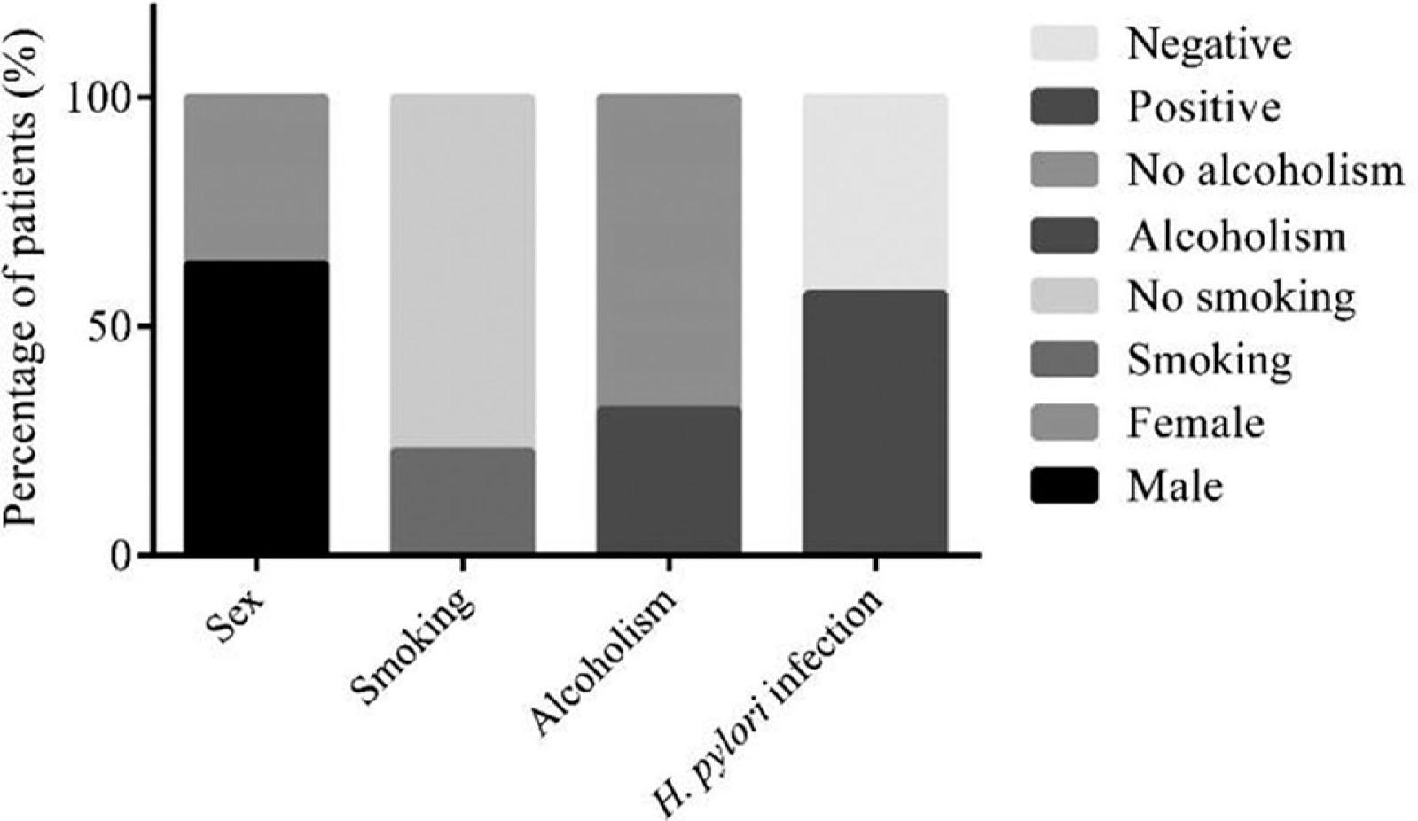 This study has been approved for research ethics by the Institutional Review Board of the Faculty of Medicine, Chulalongkorn University (IRB No. 079/61). The study was conducted in compliance with the international guidelines for human research protection as the Declaration of Helsinki. The authors retrospectively reviewed the medical records of patients who visited King Chulalongkorn Memorial Hospital, Bangkok, Thailand. The authors enrolled the patients who were diagnosed with gastric GIST in 5 years from January 2012 to December 2016. The definition of gastric GIST in this study was defined by diagnosis of GIST in ICD-10 diagnosis code system, combined with proven histological demonstration of GIST from the gastric specimen. The medical records were reviewed for patient information such as sex, age, onset of symptoms, chief complaint, alcohol drinking and smoking history, metastasis, and treatment. The location of tumors was explored by endoscopic reports. Histopathological and immunohisto-chemistry evidences from either endoscopic biopsy or surgical specimen were assessed for confirming the diagnosis. Moreover, Helicobacter pylori (HP) testing was also done in some patients by rapid urease test and/or urea breath test method. Statistical analyses were performed using IBM SPSS Statistics version 23. The data were descriptively analyzed and presented as mean ± standard deviation (SD).