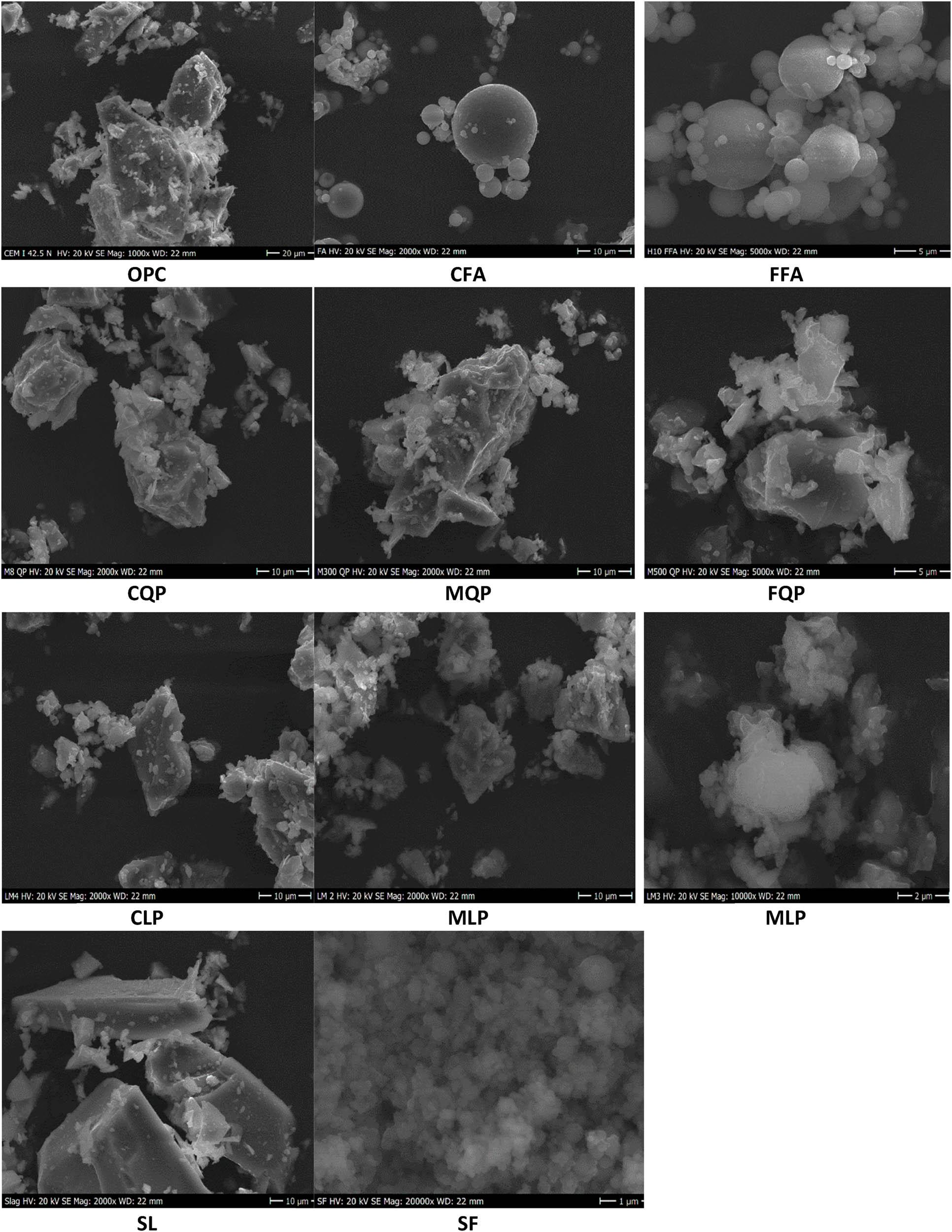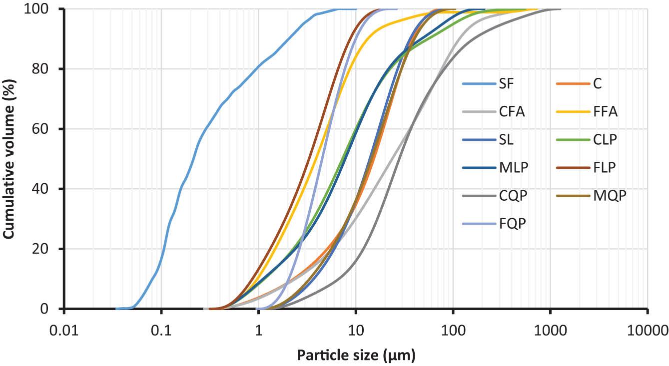 In this investigation, standardized cement (CEM I 42.5N) according to EN 197-1 was adopted for all mixes. Additionally, several mineral admixtures are used as follows: class (F) fly ash with two levels of fineness: coarse (CFA) and fine (FFA); SL; SF; inert limestone powder with three levels of fineness: coarse (CLP), medium (MLP), and fine (FLP); and inert quartz powder with three levels of fineness: coarse (CQP), medium (MQP), and fine (FQP). All used materials were provided by Sika GMBH Company and comply with EN standards. In this study, materials with fineness in the range of cement are considered coarse, while materials with higher fineness are considered fine. The measured chemical composition and physical properties of the used fine materials are summarized in Table 1. The phase composition was examined using an X-ray diffractometer and is represented in Figure 1. Also, the PSD was measured by a laser diffraction analyzer, as shown in Figure 1. Typical scanning electron microscope (SEM) images for all mineral admixtures used in this study are given in Figure 2.
