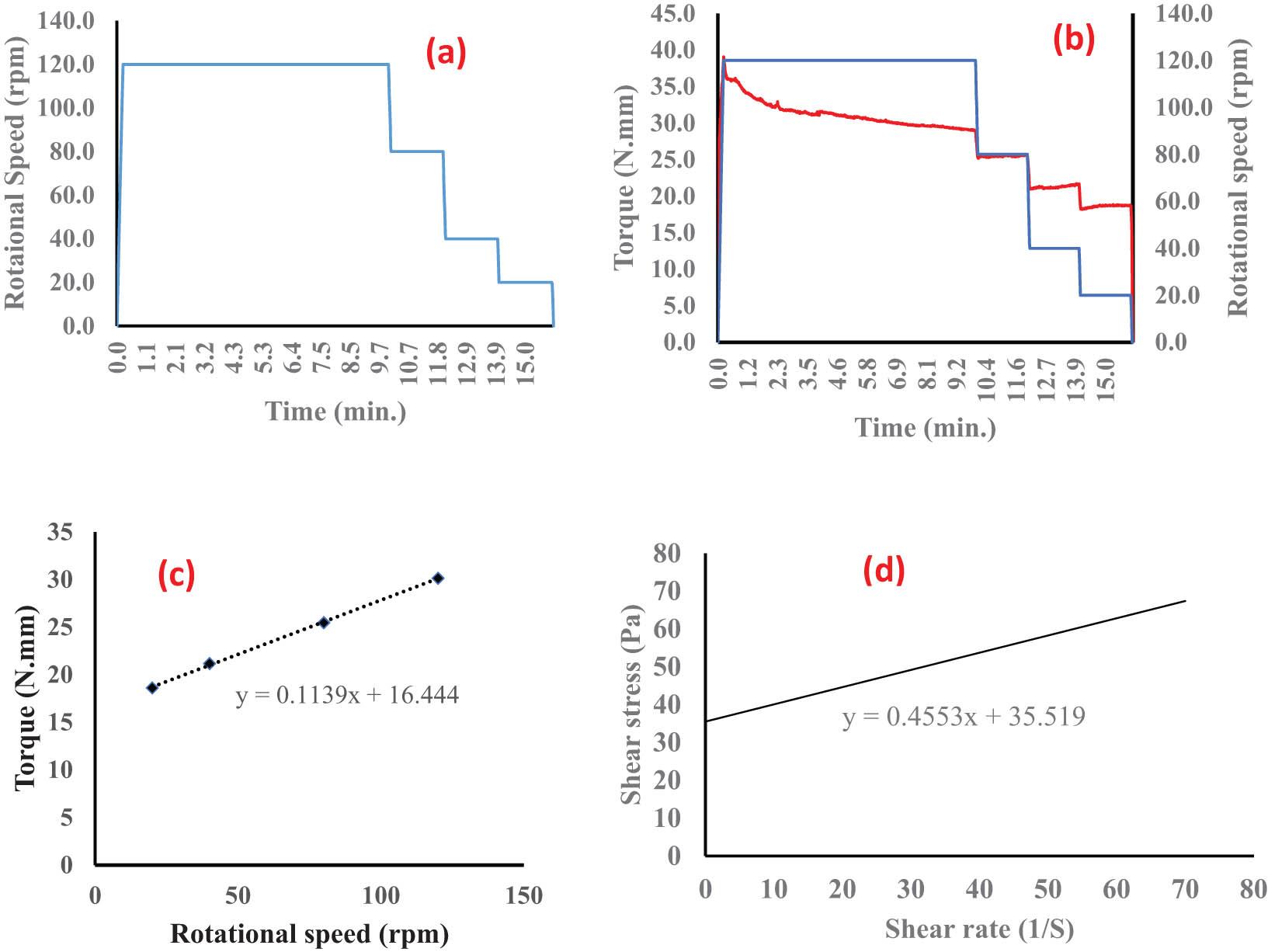 Rheometer set up and procedure for determination of visco-elastic properties. (a) Rotational speed vs time protocol; (b) moment of resistance of measurements for the control paste; (c) regression line for torque vs rotational speed and (d) conversion of torque and rotational speed measurements into shear stress and shear rate using a ffine translation.
