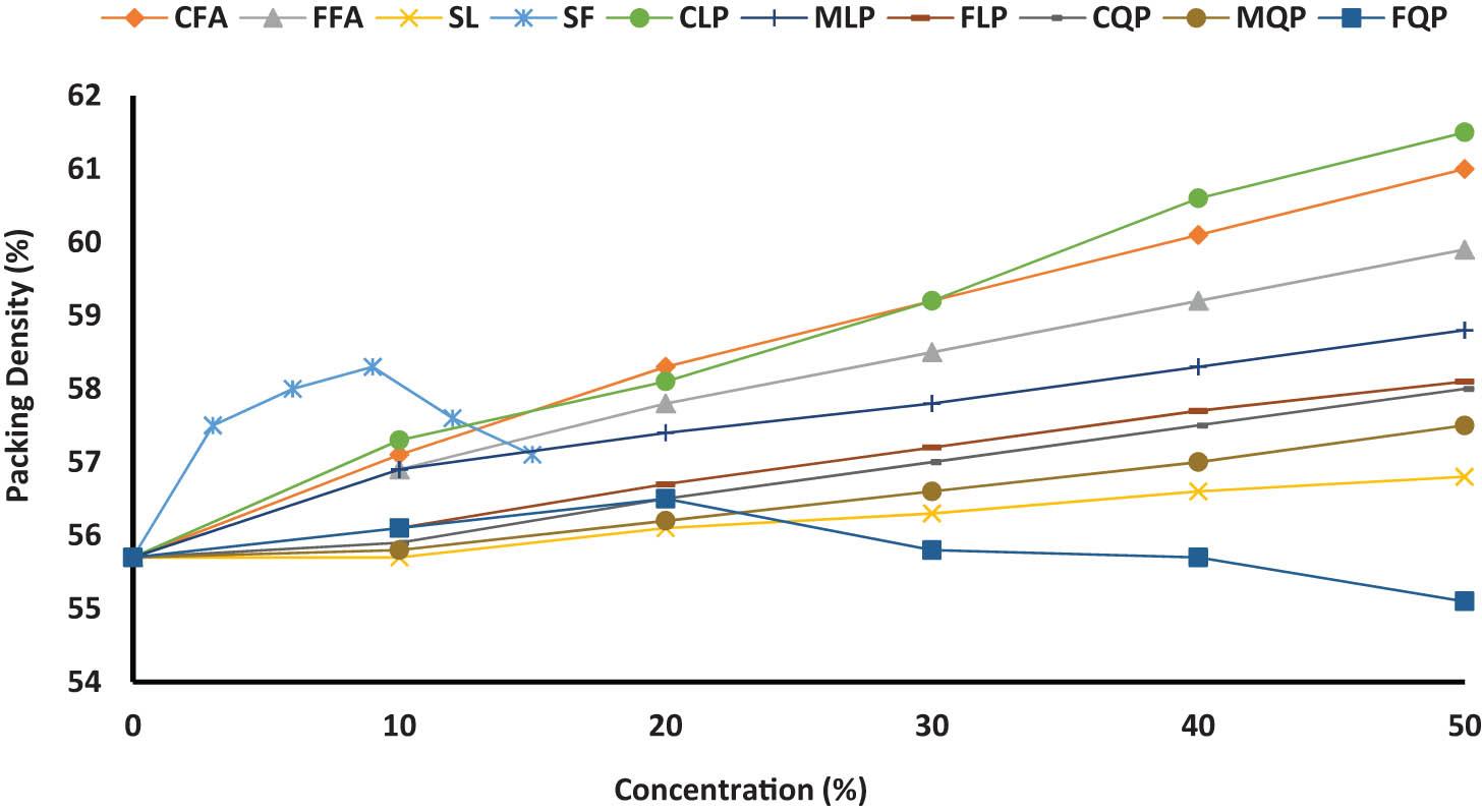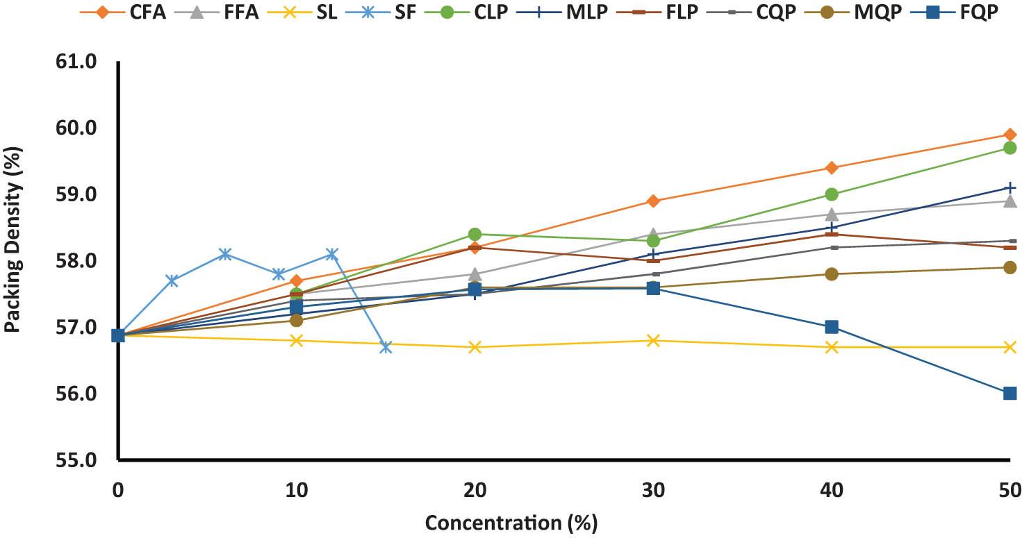 Broadly speaking, the effects of various materials on PD using centrifugal consolidation follow the same pattern as the De Larrard method. CFA and FFA increase the PD to 59.9 and 58.9%, respectively. SF also increases the PD at rates up to 12%; however, SF with high content, 15% significantly reduces PD. On the other hand, slag blends displayed no difference in PD measurements. This result implies that the influence of the PSD of mineral admixtures, rather than the morphology of particles, is dominant. CLP shows a perpetual increase that reaches a value of 59.7%. The favorable effect of CLP on packing was discussed earlier. In comparing LPs, both CLP and MLP show a soaring diagram over all used replacement ratios and attain values of 59.7 and 59.1%, respectively, at an LP dosage of 50%, whereas the PD of FLP escalates to 58.2% at a replacement ratio of 20%. Thereafter, the increase in PD with the increase in FLP content is negligible. A similar discussion can be made for CQP and MQP but with lower PD measurements of 58.3 and 57.9%, respectively. However, for FQP, as the content increases between 0 and 20%, there is an increase in PD by 1.3%, then the PD remains approximately the same before it eventually declines by 2.8% for mixture FQP50 due to the loosening effect of fine materials. SL and CQP approximately have a similar PSD; however, CLP50 gives a 2.1% increase in PD over SL50 as the angular morphology of SL lowers the packing of the constituent particles. The PD of any material depends mainly on the PSD, particle shape, and surface smoothness. For cement alone, the narrow PSD leads to a decrease in the filling process of particles with each other and results in poor packing. When fly ash is used, the PD increases significantly due to the wide range of particle sizes on one hand and the spherical shape of particles on the other hand. In contrast, when quartz powder and slag are used to partially substitute cement, the obtained PD decreases due to the edged shape of the particles, which increases the blocking between particles, increases the voids, and decreases the PD. The use of ultra-fine materials such as SF results in a significant increase in PD to a certain extent, while above the saturation point, it starts to decrease due to the occupying effect.