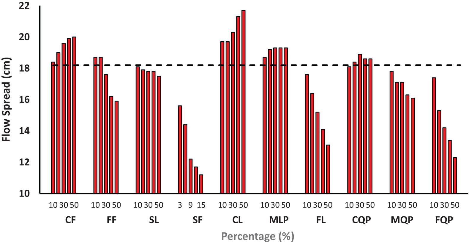 The flow spread results are shown in Figure 8. It is evident that CFA, CLP, MLP, and CQP improve flowability with increasing addition content due to the increase in PD. Comparing the flow spread of different pastes when the addition content reaches 50%, CLP, which has the highest PD, has the most favorable effect on flowability. Generally, CFA increases flowability in comparison with MLP. This could be attributed to the higher PD of CFA and the spherical geometry of its particles, which make it easier for the particles to roll against one another and improve flowability (ball bearing effect). When the fineness level of a material with a similar mineralogical composition increases, it negatively affects flowability, as manifested in FAs, LPs, and QPs. SF, although improving PD up to 12%, adversely affects the flowability of paste. Apart from the fact that increased PD increases excess water beyond that required to fill the voids between particles, the SSA governs the WFT necessary to coat the entire particle surface. Thus, for a similar amount of excess water, flowability is inversely proportional to the SSA.