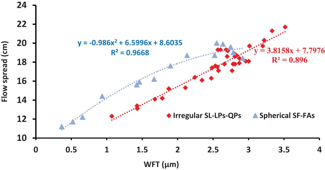 Within the scope of this study, flow spread increases linearly with WFT, with an average increment of 3.8 mm in flow for each 1 µm increment in WFT. However, the correlation has a parabolic shape for SF and FAs, arising from their sphericity and substitution percentage.