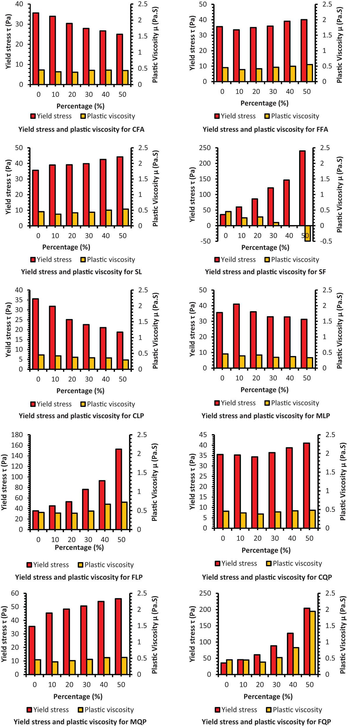 Plastic viscosity (µ) continuously decreased with the substitution of OPC by CFA, CLP, and MLP up to 50% due to higher PD. FFA, SL, and MQP all decreased (µ) at low additions, then successively increased it at high addition percentages; however, the extent of influence is largely insignificant. Conversely, the addition of FLP and FQP increases (µ) up to 50% due to reduced PD, specifically for the OPC-FQP system, and increased surface area.
