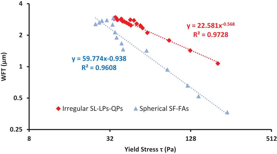 To study the influence of WFT on rheology, the relationship between yield stress and WFT is given in Figure 11. It is clearly seen that an inverse linear relationship exists when yield stress and WFT are plotted on a logarithmic scale, indicating that yield stress increases at a progressively increasing rate as WFT decreases. Moreover, depending on the particle shape, the relationship exhibits diverse behaviors. For spherical-shaped particles, yield stress decreases rapidly compared to irregular-shaped particles. It is noteworthy that the results fit well to the regression line for irregular-shaped particles and deviate from linearity for spherical-shaped particles, indicating that for irregular-shaped particles, yield stress primarily depends on WFT. Finally, the concurrence of the regression lines suggests that there is a WFT value at which the influence of particle shape on flow and rheology becomes insignificant. The pattern of the relationship between flow and yield stress is shown in Figure 12. An inverse linear relationship between flow and the logarithm of yield stress is obtained, showing that both measures are affected similarly. Additionally, flow spread is more sensitive at high flowability, whereas yield stress is more sensitive at low flowability.