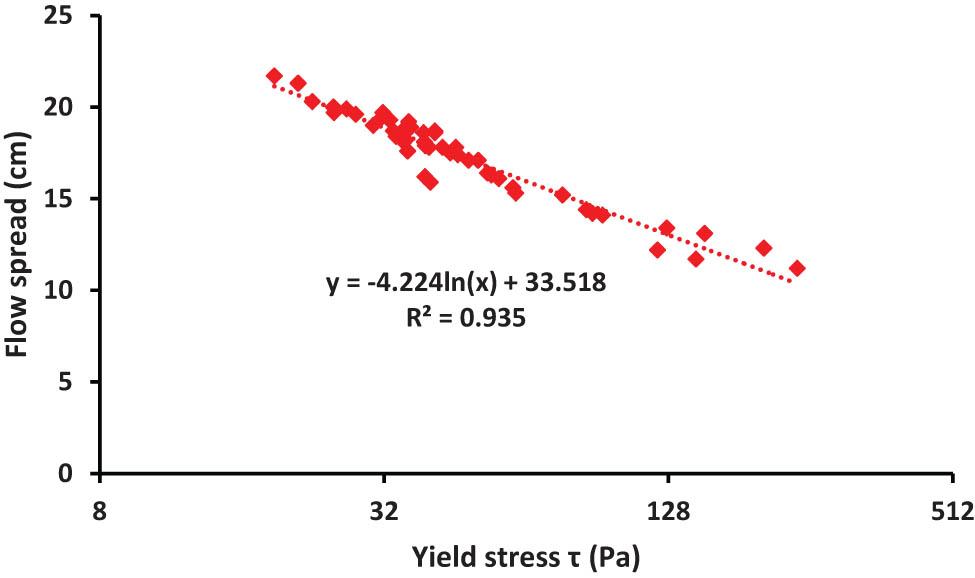 Shear stress (τ) is generally affected in a similar way as flowability. However, the variation in (τ) is more sensitive, especially for pastes with low flowability. A linear inverse relationship exists between flowability and the logarithm of shear stress.