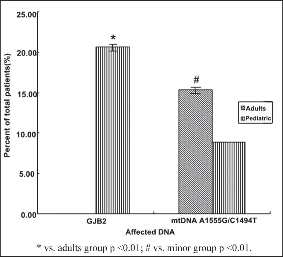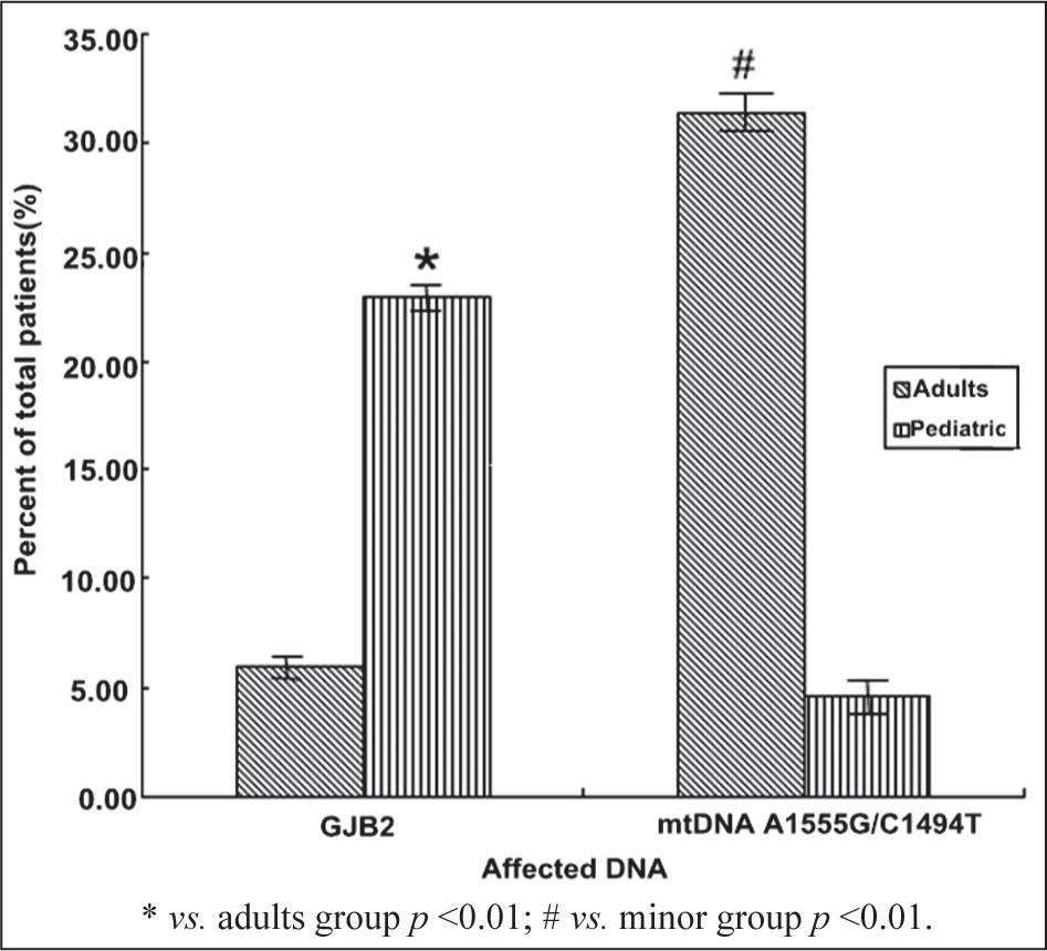Distribution of age of onset in patients with the GJB2 gene and mtDNA mutations_