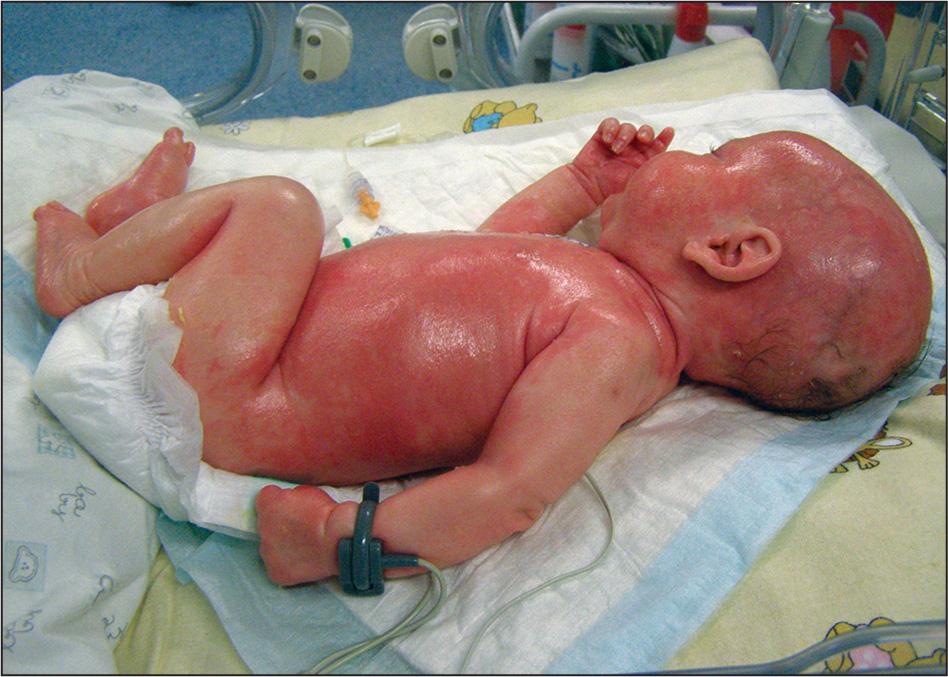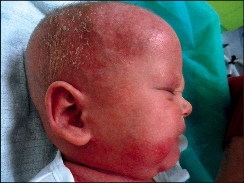 A boy [weight 2750 g, length 49 cm, occipital-frontal circumference (OFC) 30 cm] was born prematurely at the 37th week of gestation to a 43-year-old mother by cesarean section due to the transverse position. A skin examination of the proband, conducted shortly after birth, revealed generalized erythroderma covered by fine, translucent scales all over the body and scalp (Figure 1). The eyebrows and eyelashes were thin and sparse, nails with normal conformation and shape. Moreover, hypotonia was observed. An ultrasonography examination did not detect any defect of the internal organs. Starting from birth, the infant has had ongoing problems with hypernatremic dehydration.