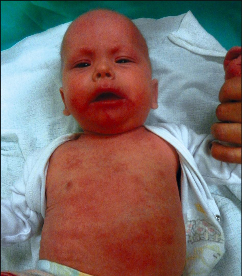 Soon after birth, the skin infections caused by Staphylococcus aureus and Pseudomonas aeruginosa were diagnosed. The boy then developed symptoms of sepsis [maximum C-reactive protein (CRP) levels of >400 mg/L] and meningitis was diagnosed. The baby developed respiratory failure that was treated with mechanical ventilation. Chronic diarrhea as an enteropathy symptom was revealed. Moreover, in the course of general infection intensifying skin lesions were observed. The immunological examination showed a decreased concentration of IgG (4.59 g/L) and C3 (0.76 g/L) components. The levels of IgG and C3 were taken 3 weeks after birth, which was 1 week prior to sepsis. Tricuspid and pulmonary valve insufficiency was identified in the echocardiography and the abnormalities of intraventricular repolarization and conduction were present on the electrocardiogram (ECG). At the age of 7 months, the child was diagnosed with bilateral hypoacusia.