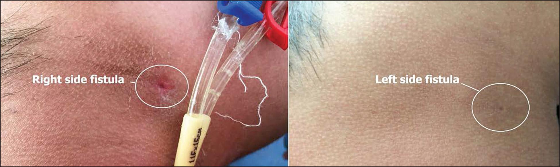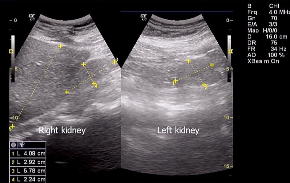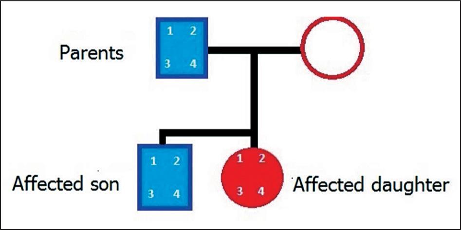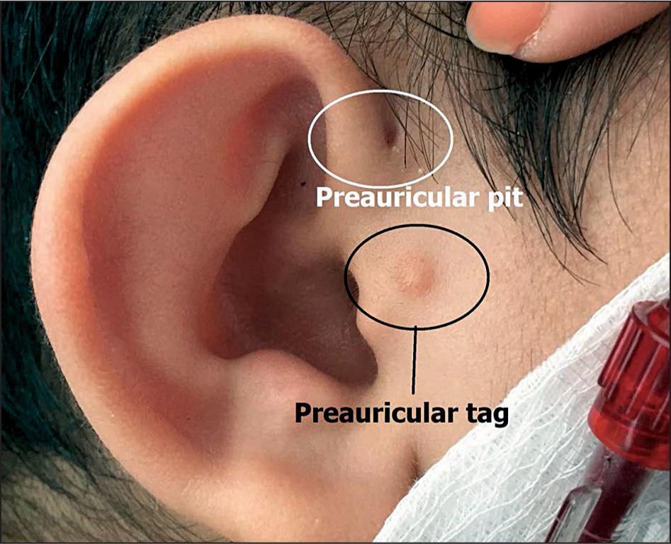 Auricular pinnae deformity with pre-auricular pit and tag (circled).Bilateral branchial fistulae.Bilateral kidney hypoplasia.Family pedigree of the patient. Presence or absence of the four main features of BOR syndrome are marked by numbers. 1: Pre-auricular pits; 2: hearing loss; 3: branchial fistulae; 4: renal abnormalities.