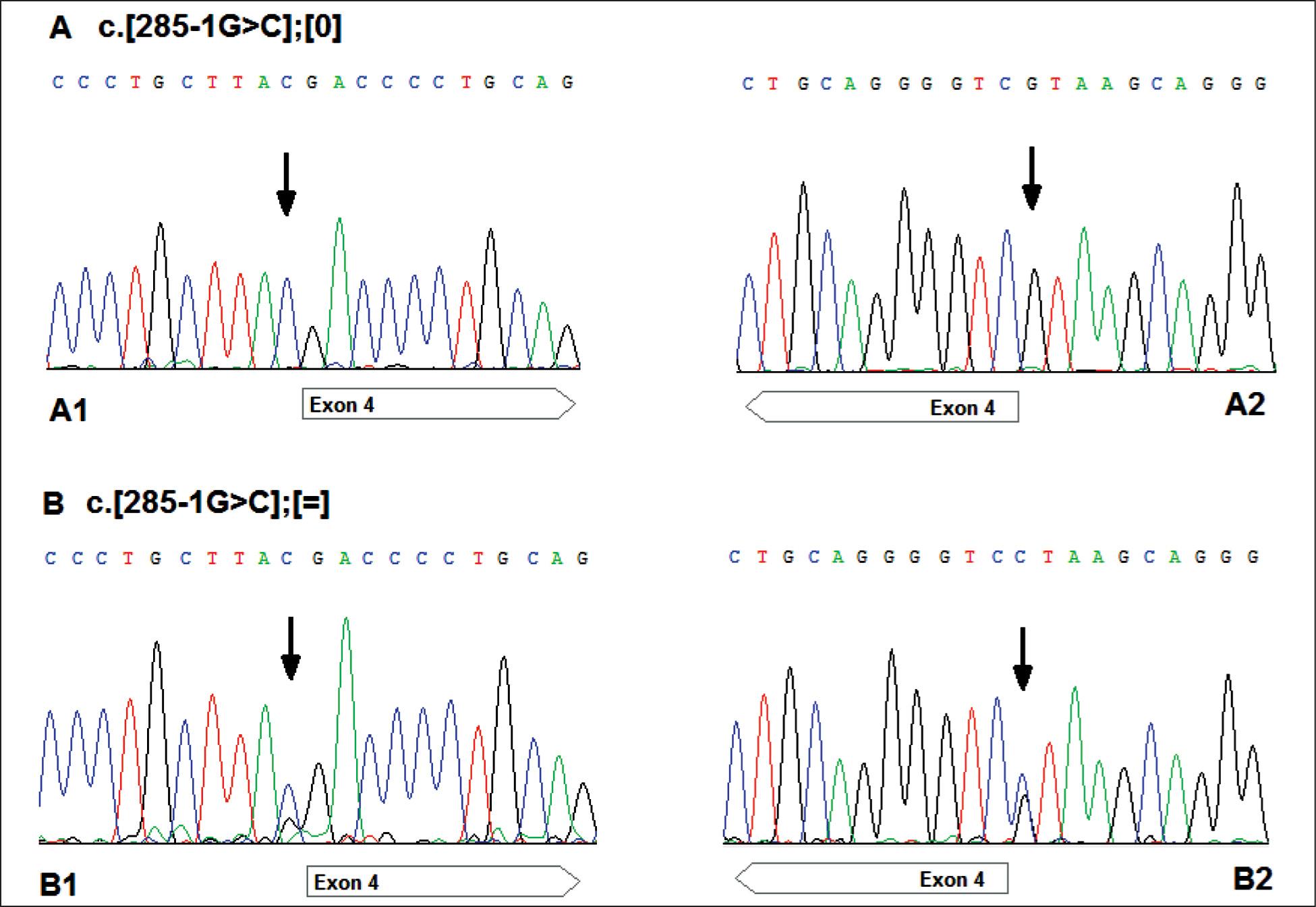 (A) The results in the fetus and proband’s sibling: hemizygous mutation (c.[285-1G>C];[0]); A1: forward strand; A2: reverse strand.
