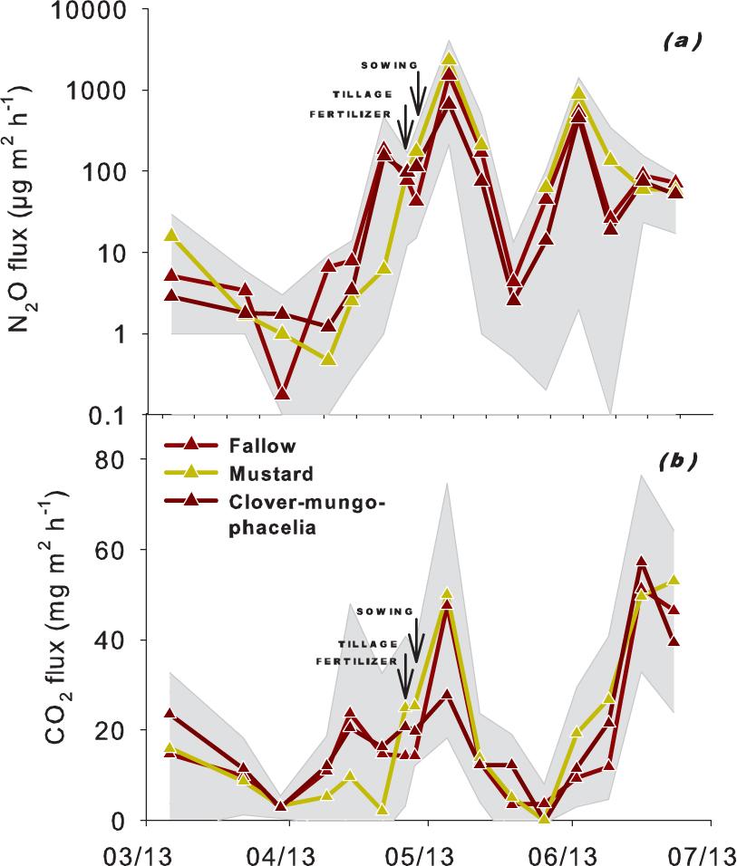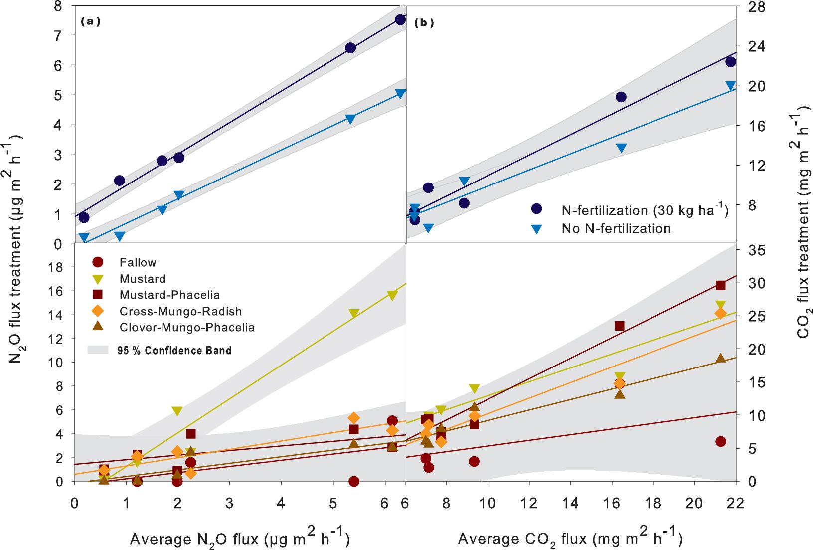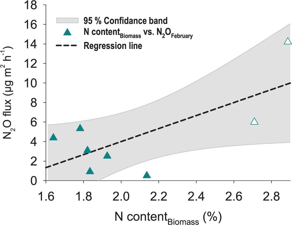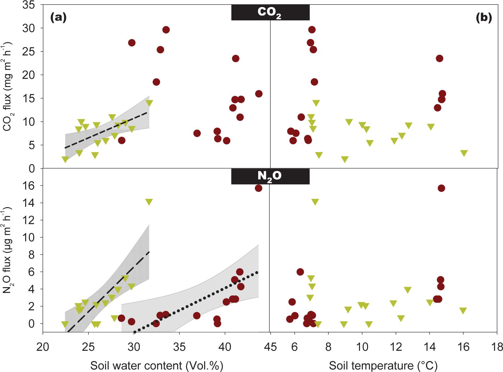 | Soil water content vs. N2O | y = -24.63 + 1.04x | 0.56 | 0.001 |