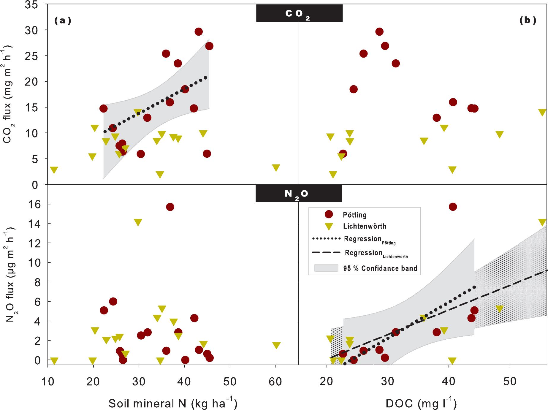 | Lichtenwörth | DOC vs. N2O | y = -5.21 + 0.26x | 0.58 | 0.011 |