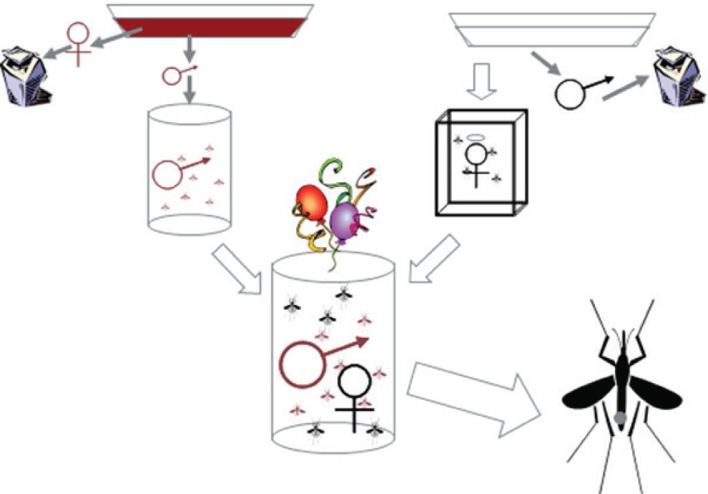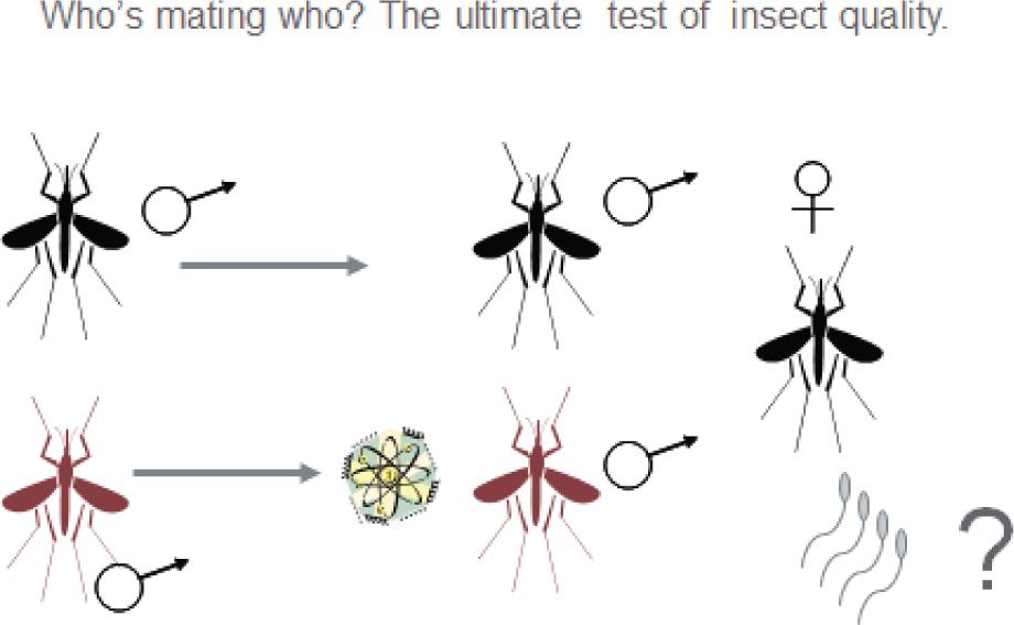 The sperm transfer from male to female mosquitoes can be measured by isotope labeling. One set of mosquitoes are isotopically labeled (represented by the red color); the labeled females are discarded and another set of males are raised naturally. Then, the isotope-labeled sperm is traced from the males into the unlabeled female’s spermathacae. In the real experiments, both differentially treated (either fertile or sterilized and regular or labeled) male mosquitoes are added to the cage and compete for the females to determine the impacts of the sterilization process on the mosquito’s ability to mate with the females.Abbildung 3. Der Spermientransfer von männlichen zu weiblichen Stechmücken kann durch die isotopische Markierung gemessen werden. Ein Satz von Stechmücken ist isotopisch markiert (in roter Farbe dargestellt), die markierten Weibchen werden verworfen und ein weiterer Satz an Männchen wird natürlich großgezogen. Dann wird das isotopisch markierte Sperma des Männchen in die nicht markierte Spermathek des Weibchen verfolgt. Im realen Experiment werden verschieden behandelte (entweder fertile oder sterile und normale oder markierte) männliche Stechmücken in den Käfig gesetzt und konkurrieren um die Weibchen, um den Einfluss des Sterilisationsprozesses auf die Fähigkeit der Stechmücke, sich mit Weibchen zu paaren, zu bestimmen.
