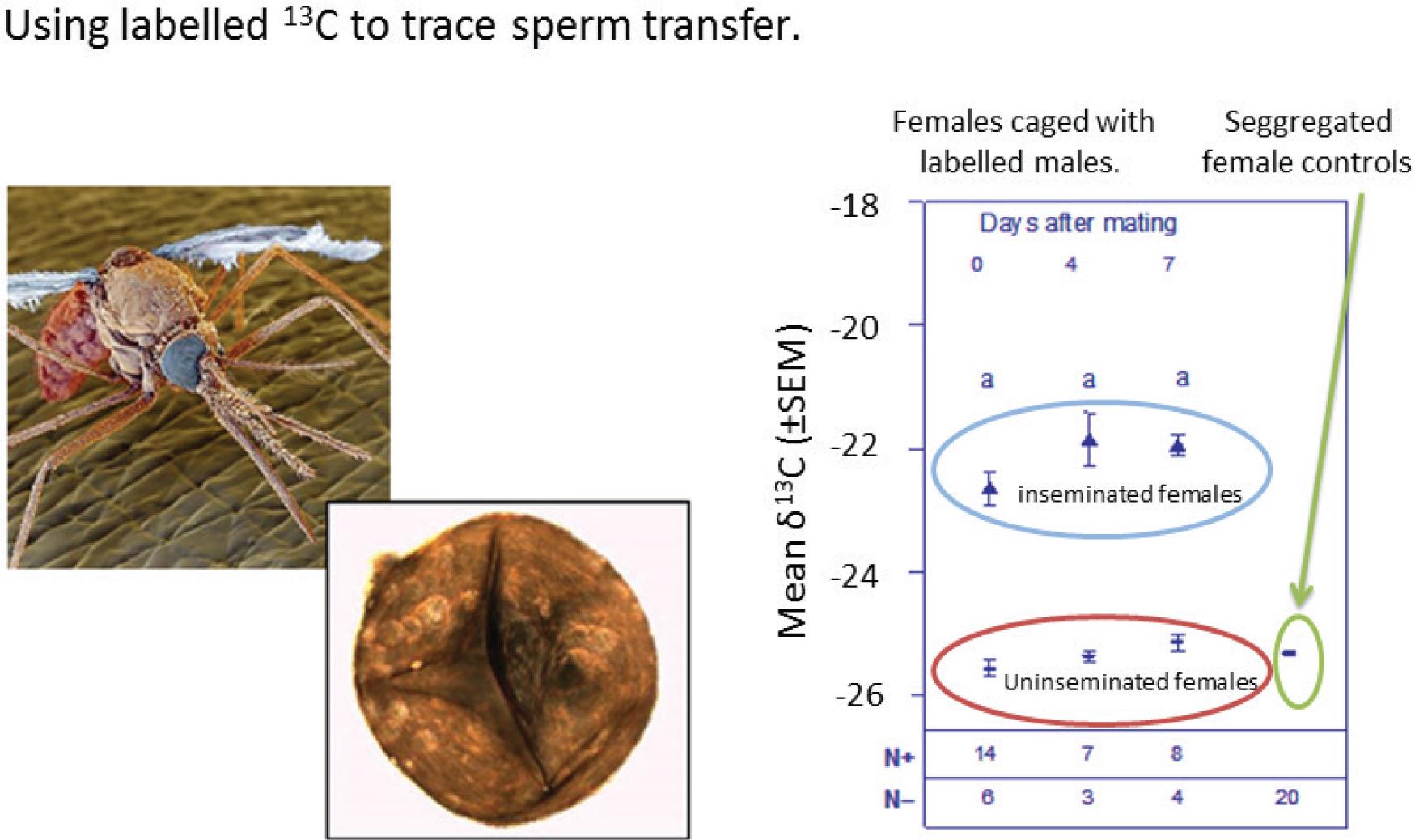 Results of 13C labeling to trace sperm transfer. From left to right: a mosquito, a female’s spermathacae, and the results from an experiment. In this experiment, female mosquitoes were inseminated (upper triangles) by 13C isotopically labeled males or not inseminated (lower bold lines). N+ is the number of analyzed inseminated females and N-is the number of uninseminated females as determined by microscopy. Segregated female control is the average isotopic abundance of spermathacae in females that had no contact with males and were raised on regular diets. All isotope values are referred back to international isotope standards, and error bars are standard error of the mean.Abbildung 4. Ergebnisse der 13C Markierung für die Nachverfolgung des Spermientransfers. Von links nach rechts: eine Steckmücke, eine weibliche Spermathek und die Ergebnisse des Experiments. In diesem Experiment wurden weibliche Moskitos durch 13C isotopisch markierte Männchen inseminiert (obere Dreiecke) oder nicht inseminiert (untere fette Linien). N+ ist die Anzahl an analysierter inseminierter Weibchen und N-ist die Anzahl an analysierter nicht inseminierter Weibchen (Bestimmung mittels Mikroskopie). Die abgetrennte weibliche Kontrolle gibt die durchschnittliche Häufigkeit von Spermatheken bei Weibchen an, die keinen Kontakt zu Männchen hatten und mit normalem Futter großgezogen wurden. Alle Isotopenwerte beziehen sich auf internationale Isotopenstandards, Fehlerbalken sind die Standardfehler der Mittelwerte.