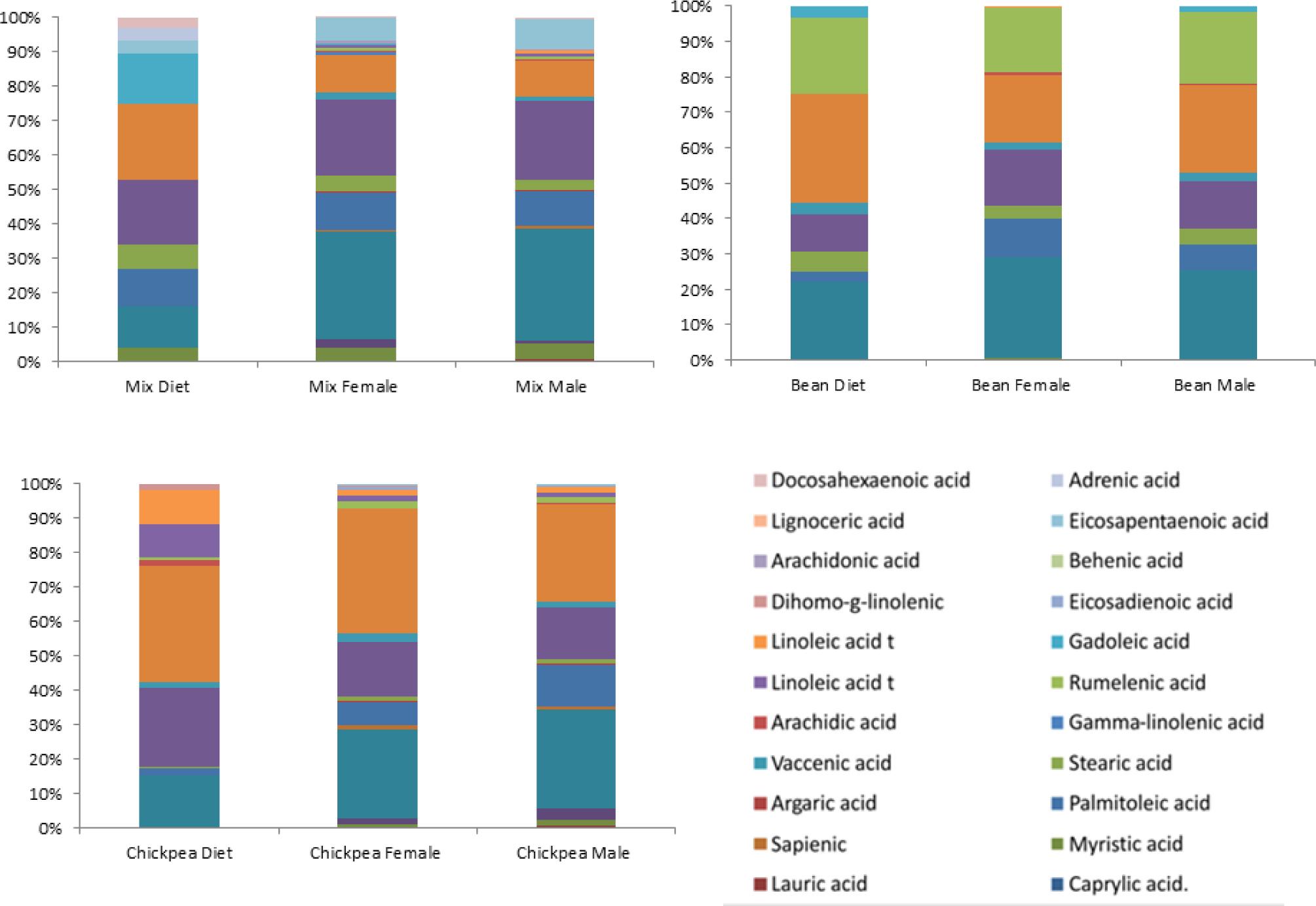 Percentage of relative abundance of fatty acids of the diet and the resulting female and male mosquitoes reared on that diet. The profiles are average of three replicate mosquitoes. In essence, this graph shows that for mosquitoes at least, you are essentially what you eat and that the fatty acid profile of the diet is directly retained in the adult form.Abbildung 5. Prozentuelle relative Häufigkeit der Fettsäureprofile des Futters und der damit gefütterten männlichen und weiblichen Steckmücken. Die Profile sind Mittelwerte von drei Wiederholungen. Die Kernaussage dieser Graphik ist, dass das Fettsäureprofil des Futters direkt im erwachsenen Tier wiedergefunden werden kann.