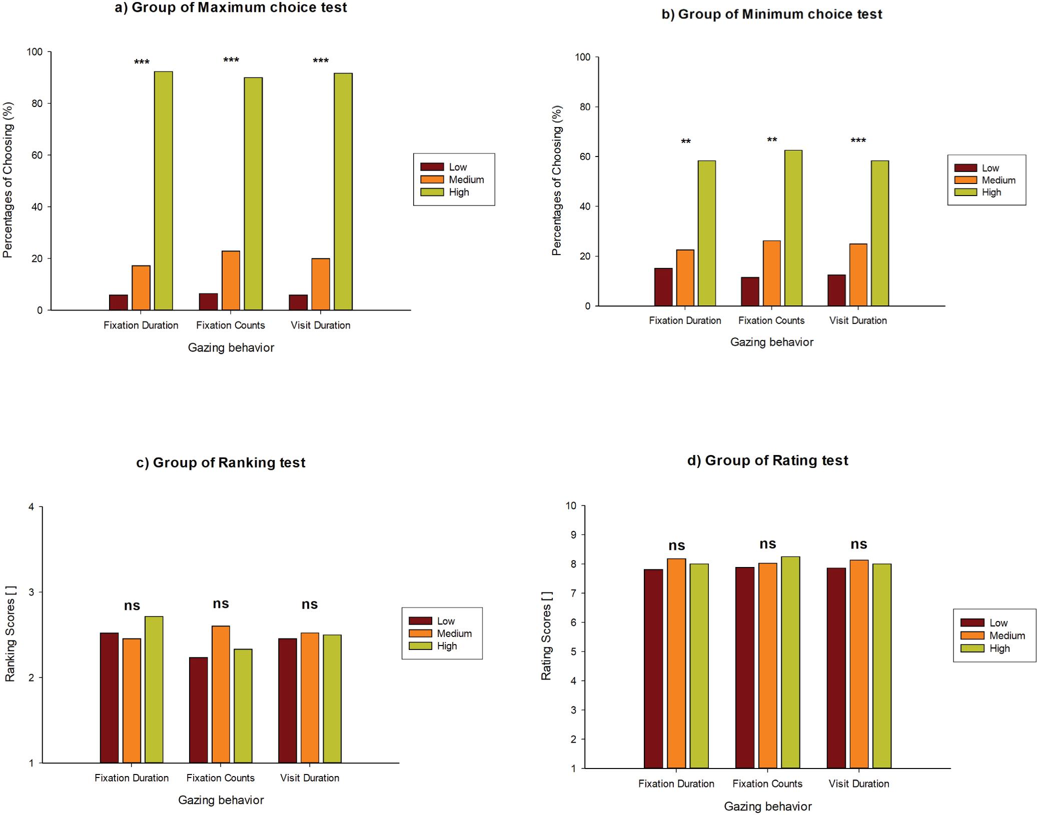 | Gazing parameters | Group of Maximum choice p-values of the chi-square (χ2) test of independence between gazing behaviour and consumer’s choices | Group of Minimum choice p-values of the chi-square (χ2) test of independence between gazing behaviour and consumer’s choices | Group of Ranking p-values of the one-way ANOVA between gazing behaviour and consumer’s ranking scores or rating points. | Group of Rating p-values of the one-way ANOVA between gazing behaviour and consumer’s ranking scores or rating points. |
