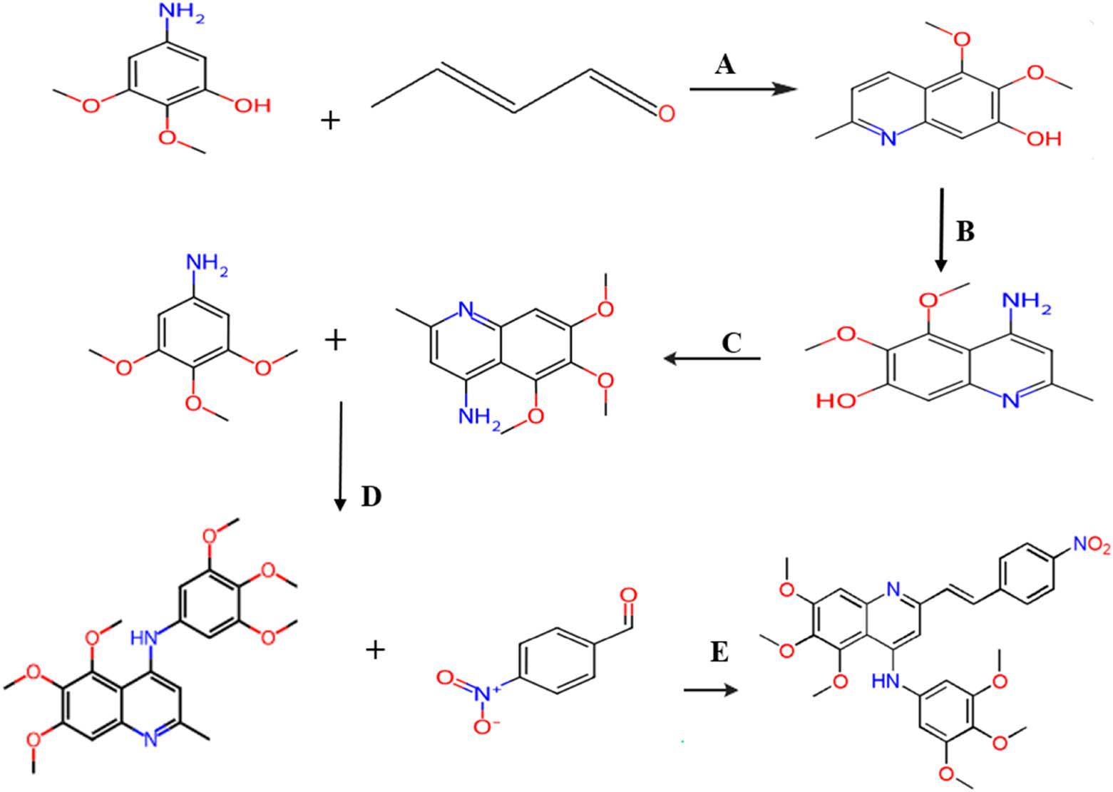 2D view of the binding conformation for the newly designed compounds (M1, M2, M3, and M4) and compound 22 with the target tubulin–colchicine complex (PDB ID: 4O2B)