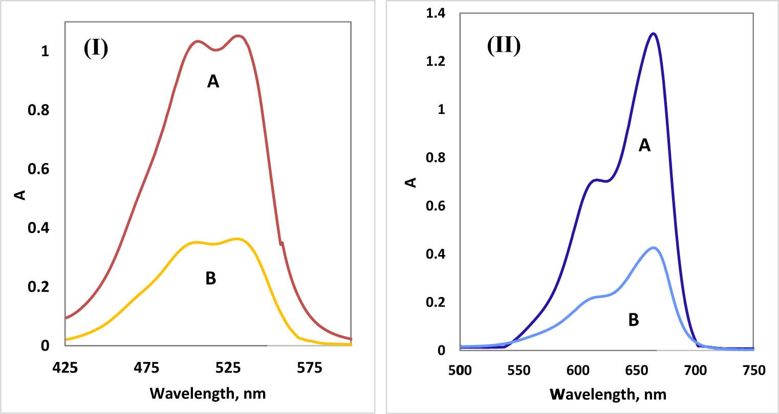 Absorption spectra analysis: Panel I (a): Baseline absorption spectrum of AR dye (concentration: 20 mg/L) without MM-MDH nanoclay. Panel I (b): Spectrum post interaction with 10 mg of MM-MDH nanoclay. Panel II (a): Initial absorption spectrum of MB dye (concentration: 8 mg/L) without MM-MDH nanoclay. Panel II (b): Spectrum after exposure to 7.5 mg of MM-MDH nanoclay.