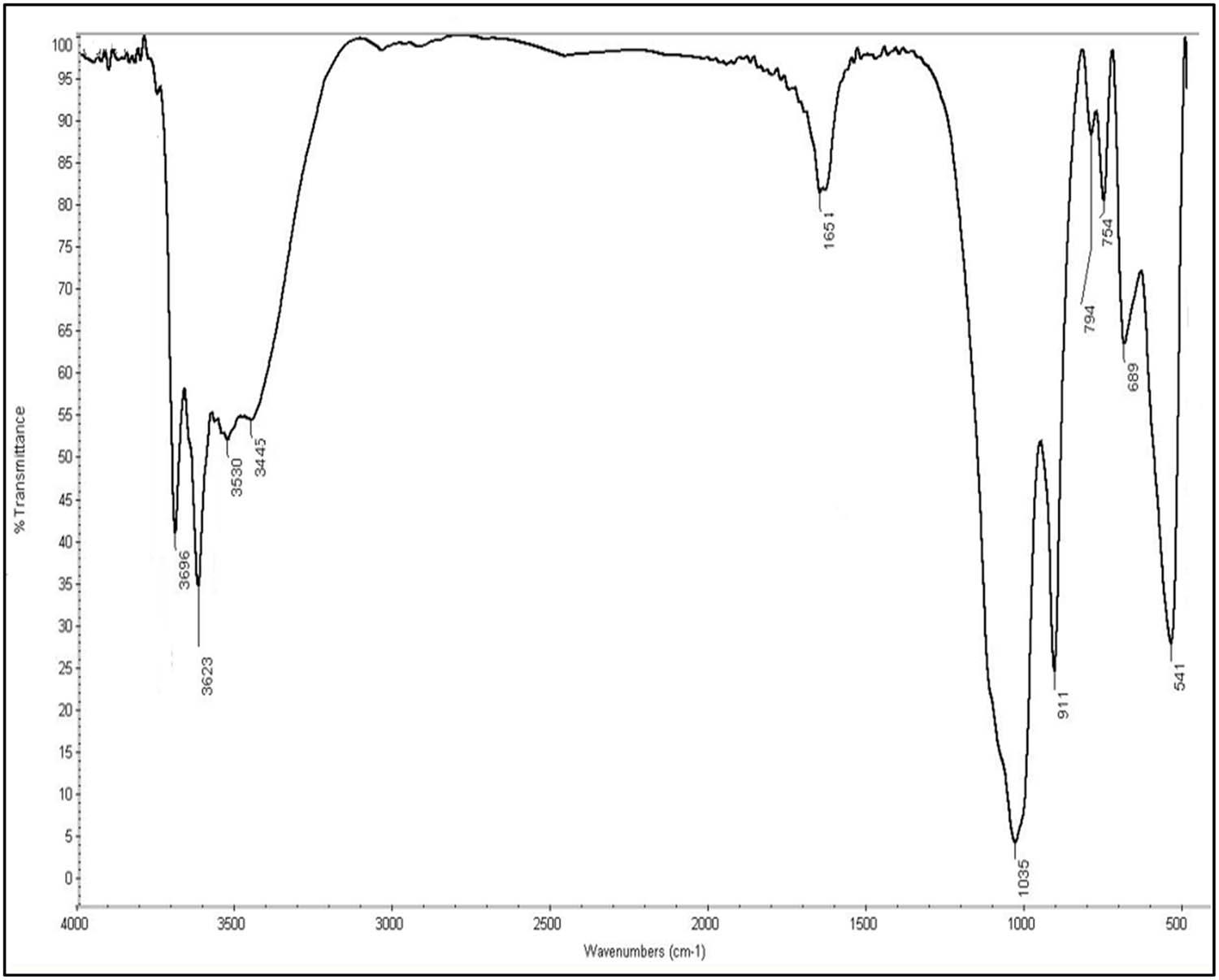 Figure 4 presents the FT-IR spectroscopy results for montmorillonite nanotubes. Broad peaks at 3,400 cm−1 typically indicate the O–H stretching vibrations, suggesting the presence of hydroxyl groups or water molecules within the nanotube structure. This is common in clays due to their hydrophilic nature and the ability to intercalate water molecules between the layers. The sharp peaks around 1,630 cm−1 are characteristic of O–H bending vibrations, often associated with water absorbed in the material. The peaks at 1,000–1,100 cm−1 are indicative of Si–O stretching vibrations in the silicate layers, fundamental to the structure of montmorillonite [31]. The sharpness and position of these peaks can give insight into the degree of order in the silicate framework and any substitutions within the lattice. The lower frequency peaks (below 600 cm−1) can be attributed to metal–oxygen bonds, such as Al–O and Mg–O [32], which are integral to the octahedral and tetrahedral sheets of the montmorillonite structure. The FT-IR spectrum of montmorillonite nanotubes confirms the complex structure of these materials, highlighting their potential for various applications. The presence of functional groups like hydroxyls suggests their capability for further chemical modifications or functionalization, which could be beneficial in applications ranging from catalysis to drug delivery systems. Additionally, the spectral features indicating water content are crucial for applications in the removal of toxic dyes.