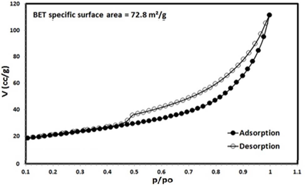 Figure 6 illustrates the BET surface area analysis of montmorillonite nanoclay, conducted at a temperature of 77 K. The curve starts with a steep rise at lower relative pressures, indicating monolayer adsorption of nitrogen gas. This initial portion is crucial as it reflects the accessible surface area of the montmorillonite nanoclay. As the relative pressure increases, the slope of the curve becomes moderate, suggesting the beginning of multilayer adsorption up to the point where the curve starts to plateau [39]. Towards higher pressures, the isotherm plateaus, indicating that the maximum adsorption capacity has been reached, and the pores are filled with nitrogen gas. The specific surface (BET) was calculated to be 76.4 m2 g–1. The significant rise at low pressures suggests a high surface area, which is characteristic of clays with fine particle sizes and open structures [40]. High surface areas are beneficial for applications requiring efficient interaction with other substances, such as in catalysis or adsorption processes. The shape of the isotherm can give indications about the pore size distribution. The montmorillonite nanoclay likely possesses a range of pore sizes, as inferred from the continuous adsorption beyond the monolayer formation, suggesting the presence of mesopores [41]. The high surface area and porosity make montmorillonite nanoclay an excellent candidate for dye removal.