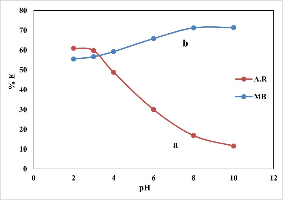 Impact of pH on dye adsorption percentages for AR (a) and MB (b) using MM-MDH nanoclay; 0.01 ± 0.002 g for AR and 0.0075 ± 0.002 g for MB.