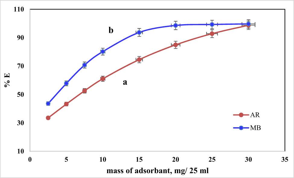 Figure 8 depicts the influence of MM-MDH nanoclay mass on the adsorption efficiency for AR and MB dyes, conducted using a constant dye concentration (20 mg/L for AR and 8 mg/L for MB). The graph shows the adsorption percentage increasing as the dose of MM-MDH nanoclay is increased from 2.5 to 30 mg for both dyes. The adsorption percentage of AR dye increases dramatically from 33.5% at a 2.5 mg dose of nanoclay to 98.7% at a 30 mg dose. This steep increase suggests a significant enhancement in adsorption capacity with the increase in nanoclay amount. Similarly, MB dye shows an increase in adsorption from 43.6% at the lowest nanoclay dose to 99.6% at the highest dose. The adsorption efficiency improves consistently as the dose increases. As the amount of MM-MDH nanoclay increases, so does the total available surface area. More surface area provides more active sites for dye molecules to adhere to, which enhances the adsorption capacity [44]. Higher doses of nanoclay improve the likelihood that dye molecules encounter an available adsorption site, thus reducing the probability of dye molecules remaining in the solution. The primary mechanism here appears to be physical adsorption, where dye molecules are trapped on the surface of nanoclay particles. The findings underscore the importance of optimizing nanoclay dosing in treatment processes to maximize dye removal while considering economic factors. These results could guide the development of scaled-up water treatment protocols that use MM-MDH nanoclay as an adsorbent for removing dye pollutants from industrial effluents.