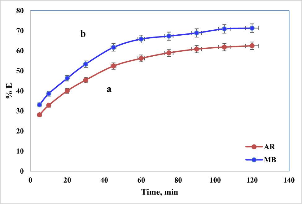 Figure 9 demonstrates the effect of shaking time on the adsorption percentages of AR dye and MB dye by MM-MDH nanoclay at a temperature of 22°C. The graph presents time intervals ranging from 5 to 120 min and showcases how the adsorption efficiency changes over these intervals for both dyes. The adsorption of AR dye starts at a moderate level and significantly increases with time, peaking at 120 min. This increase is gradual, indicating that the interaction between the dye and the nanoclay surfaces strengthens over time [45]. Similarly, MB dye shows an increase in adsorption efficiency as time progresses, with the highest adsorption also occurring at the end of the 120-min interval. The pattern of increase is steady, suggesting a continuous accumulation of dye on the nanoclay. The increase in dye removal over time can be attributed to the kinetics of the adsorption process, where initially, a large number of active sites are available, and over time, these sites gradually become occupied [21]. The continuous increase up to 120 min suggests that the saturation point of the nanoclay is not reached within this duration for both dyes. This implies that longer contact times could potentially lead to even higher adsorption efficiencies until all active sites are filled.