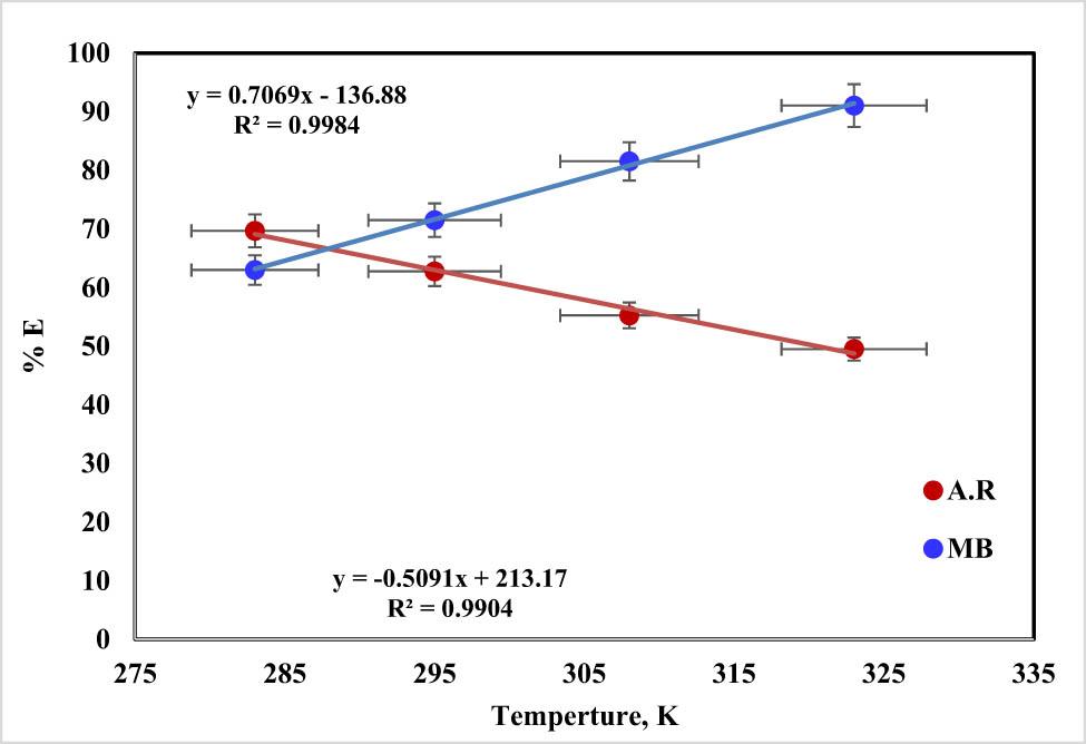 Figure 10 illustrates the effect of temperature on the adsorption efficiency of AR dye and MB dye using MM-MDH nanoclay. This graph presents the adsorption percentages at various temperatures, ranging from 10 to 50°C. The adsorption efficiency of AR dye increases as the temperature rises from 10 to 50°C. Starting at a relatively low percentage of 10°C, there is a significant improvement in adsorption as the temperature increases, demonstrating higher efficiency at elevated temperatures. Similarly, MB dye shows an increase in adsorption percentage with temperature. The adsorption starts at a moderate level of 10°C and progressively increases, reaching its peak at 50°C. Higher temperatures provide more kinetic energy to the dye molecules, increasing their movement and the probability of contacting the adsorbent sites on MM-MDH nanoclay [41]. This enhanced movement helps overcome any resistance to mass transfer between the aqueous phase and the adsorbent surface. Temperature influences both the adsorption capacity and the rate of adsorption. For physisorption, increased temperature typically enhances the rate of adsorption until a certain point, after which the adsorptive forces may weaken [46]. However, for chemisorption, which may also play a role here, higher temperatures could promote stronger and more stable chemical interactions between the dye molecules and the nanoclay [47]. While higher temperatures can increase adsorption rates, they can also cause increased desorption [48]. In this case, the increasing trend suggests that the adsorption effects are dominant over desorption up to 50°C for both dyes. The findings indicated that increasing the temperature of the solution significantly enhanced the removal efficiency of MB dye by MM-MDH nanoclay, as illustrated in Figure 10. This trend supports the conclusion that the adsorption process is endothermic [45]. Raising the temperature of the solution resulted in reduced efficacy of AR dye removal by MM-MDH nanoclay, as illustrated in Figure 10. This trend indicates that the adsorption process is exothermic [45].