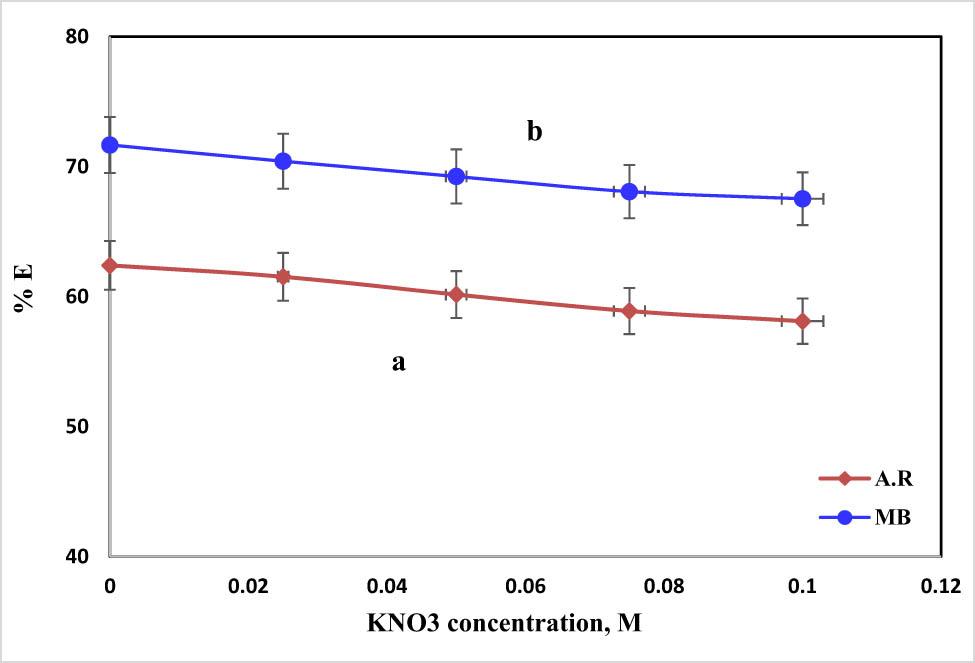 Impact of KNO3 concentration on dye removal efficiency of AR (a) and MB (b) using MM-MDH nanoclay at 22°C.