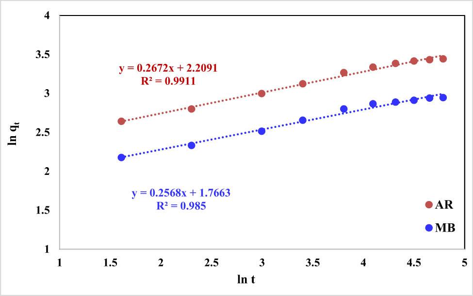 R L values for the adsorbent equal 0. 0.075 for AR and equal 0.307 for MB dyes (0 < R L < 1), which indicates favorable monolayer adsorption [62].