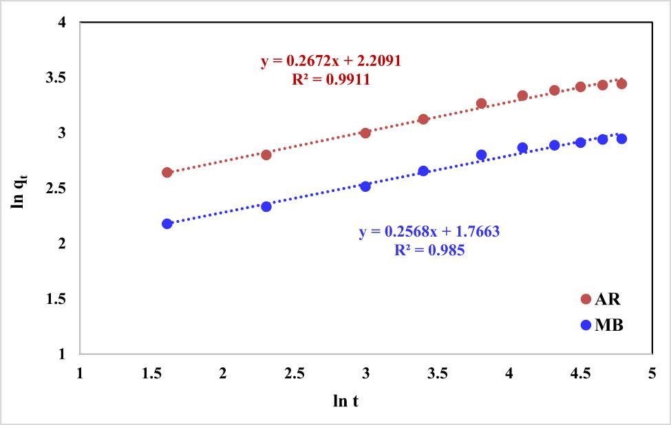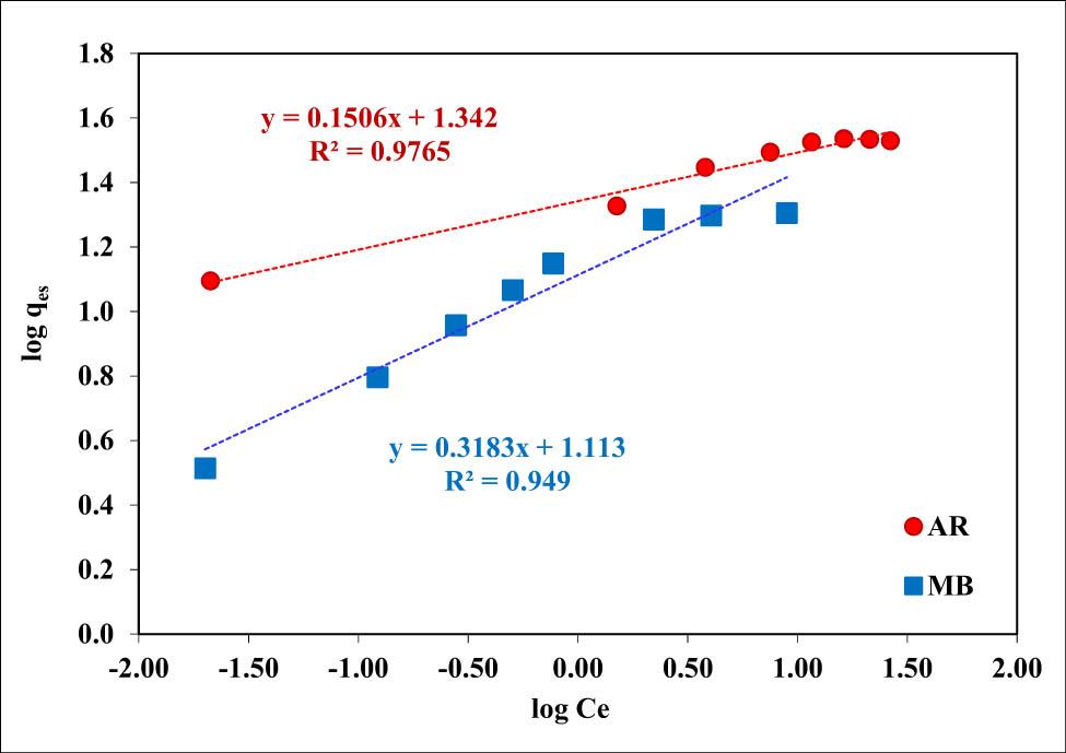 The retention behavior of AR and MB dyes from aqueous solution onto the used sorbents was subjected to the Freundlich system represented in the next form of linearity [63]: