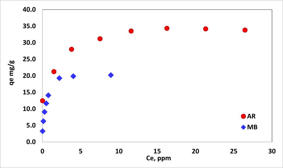 Graphical representation of AR and MB dye adsorption on MM-MDH nanoclay (mg/g) versus equilibrium concentration (C e) at 22°C.