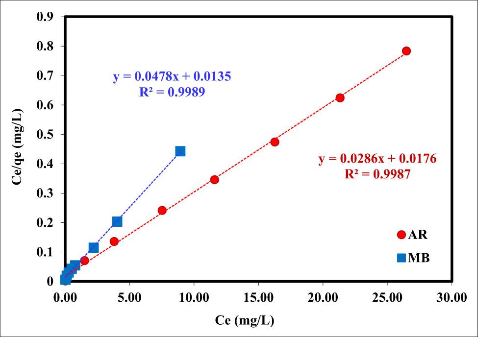 The term C e refers to the equilibrium concentration of AR and MB dyes in an aqueous solution, expressed in milligrams per liter (mg/L), whereas C a denotes the amount of AR and MB dyes adsorbed on the solid surface at equilibrium, also measured in milligrams per liter (mg/L).
