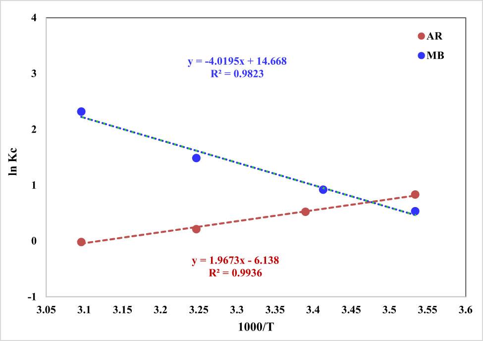 Logarithmic plots of equilibrium constants (ln K c) versus inverse temperature (1,000/T) for AR and MB dye adsorption from aqueous solutions by MM-MDH nanoclay.