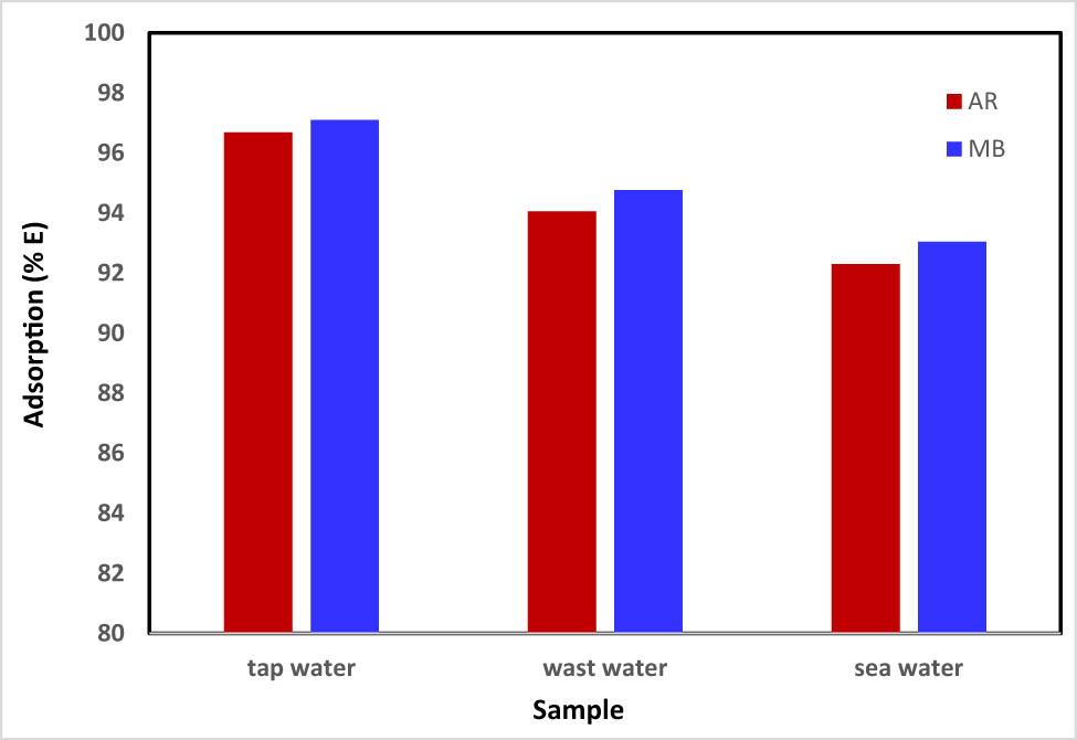 Removal efficiency of AR and MB dyes using MM-MDH nanoclay across three real-world samples (experimental conditions: 25 mL solution, contact time = 120 min, pH solution = 2, temperature = 295 K, 30 mg of MM-MDH nanoclay and 20 mg L−1 concentration for AR dye, and for MB dye 25 mL solution, contact time = 120 min, pH solution = 8, temperature = 295 K, 30 mg of MM-MDH nanoclay, and 8 mg L−1 concentration).