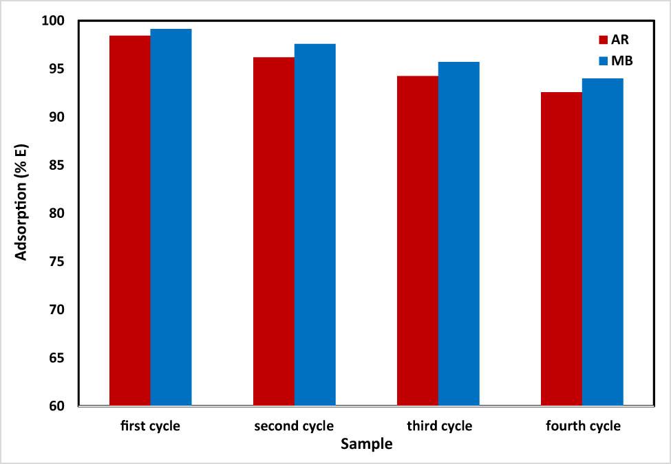 The reusability effect of MM-MDH nanoclay for removal of AR and MB dyes four times, (experimental conditions: 25 mL solution, contact time = 120 min, pH solution = 8, temperature = 295 K, 30 mg of MM-MDH nanoclay and 8 mg L−1 concentration for MB dye, and for the AR dye 25 mL solution, contact time = 120 min, pH solution = 2, temperature = 295 K, 30 mg of MM-MDH nanoclay and 20 mg L−1 concentration).