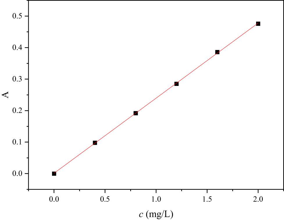 Different volumes of iron standard solution (0.00, 2.00, 4.00, 6.00, 8.00, 10.00 mL) with the Fe3+ content of 10 mg/L were added to six 50 mL volumetric flasks. The sample preparation test was carried out according to the standard methods [18]. The standard curve was plotted as shown in Figure 1, using the iron content as the horizontal coordinate and absorbance as the vertical coordinate. The standard curve equation was y = 0.2384x + 0.0011, and R 2 = 0.9998.