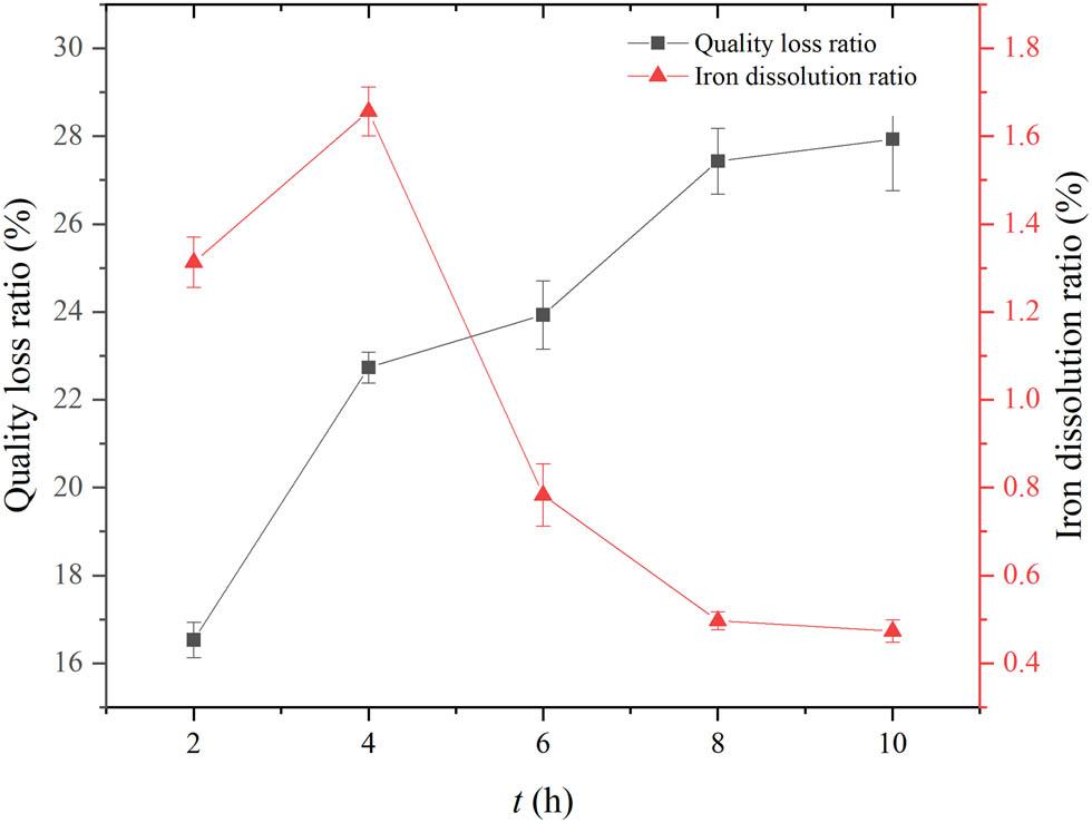 Figure 2 shows the effect of acid etching time on the dissolution behavior of iron components in basalt fiber raw silk. It can be seen from Figure 2 that with the extension of the acid etching time, the mass loss of the raw silk increased continuously, but the dissolution rate of the iron component first increased and then decreased, finally tending to balance. In addition to iron, basalt fiber also contains a large amount of aluminum, magnesium, titanium, and other components that can react and dissolve under acidic conditions. With the extension of reaction time, the reaction develops from the surface to the deep layer, destroys the lattice, and releases the embedded metal elements, leading to the mass loss of basalt fiber raw silk [19]. The iron component in basalt fibers is dominated by the presence of Fe3+ and Fe2+. In the sulfuric acid solution system with pH < 3.0 under higher concentrations of Fe3+, FeOOH can be formed in the solution after a long time at high temperatures. At the same time, trace Ti(IV) fractions in basalt fibers can hinder the dissolution of FeOOH [20,21]. To suppress FeOOH formation, control of Fe2+ oxidation requires both low pH and reduced temperature which is necessary. Therefore, the iron component in basalt fiber is continuously dissolved in dilute sulfuric acid at high temperatures, and then the dissolved iron component is precipitated and dissolved, and finally reaches equilibrium [22].