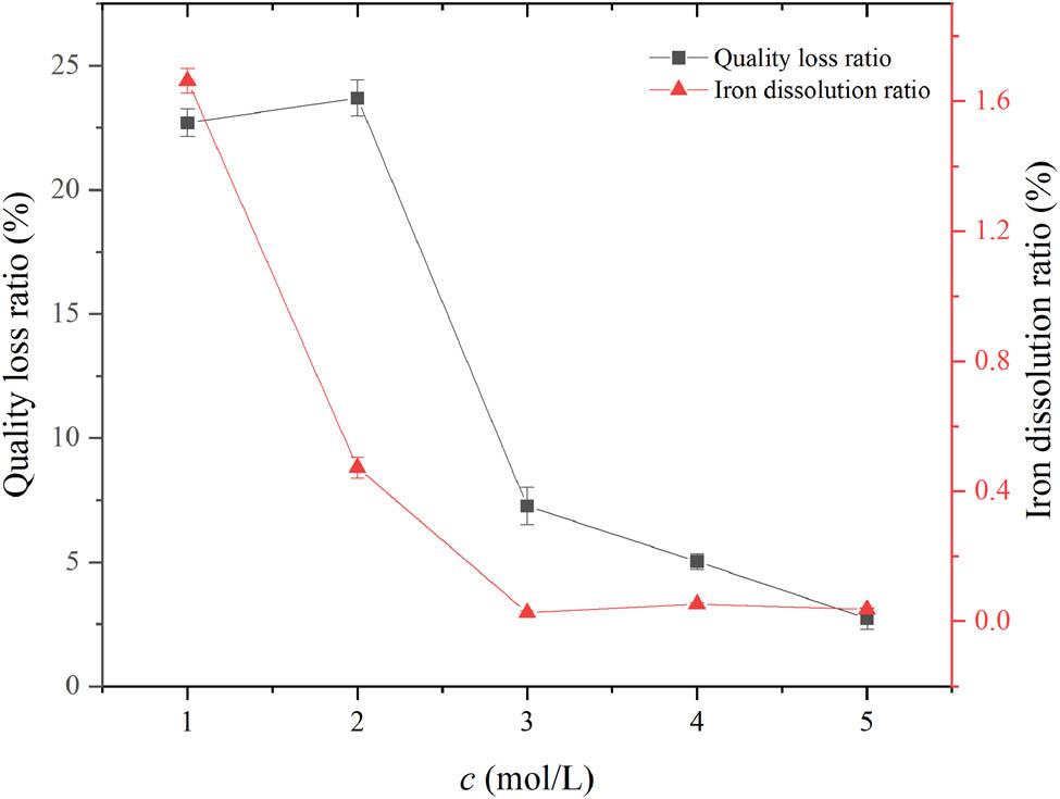 Figure 3 shows the effect of sulfuric acid concentration on the dissolution of iron components in the basalt fibers. With the increase of sulfuric acid concentration, the mass loss of basalt fiber increased slightly and then decreased, while the dissolution rate of the iron component decreased continuously. The main reason for this experimental phenomenon lies in two aspects: one is that a high concentration of sulfuric acid has a passivation effect [23]. When the acid-etching temperature is high, iron, aluminum, and other elements can form an oxide film in a sulfuric acid environment, and Fe2+ and Fe3+ in the solution can form precipitates such as ferrous sulfate monohydrate, iron oxide, and jarosite. The resulting film or precipitate will adhere to the surface of the precursor, thereby preventing the reaction from deepening internally [24,25]. Second, a larger concentration of sulfuric acid results in greater viscosity of the system, blocking molecular movement and weakening ion exchange diffusion, which is unfavorable for the dissolution of components in raw silk [26].