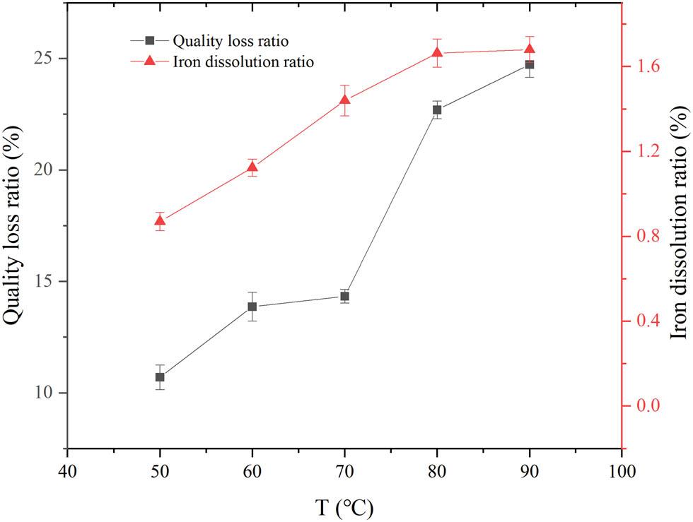 Figure 4 shows the effect of different temperatures on the dissolution behavior of the iron components in the basalt fibers. It can be seen from Figure 4 that with the reaction temperature between 50 and 90°C, the mass loss of basalt fiber and the dissolution rate of iron component both show an upward trend. When higher than 80°C, the increasing trend slows down and tends to be stable, which may be attributed to the molecular movement in the system. At high temperatures, faster molecular motion is conducive to breaking the reaction barrier, accelerating diffusion, and effectively promoting the acidolysis reaction and dissolution of iron components [27]. However, when exceeding a certain temperature, the dissolution rate of the iron component is no longer significantly increased, mainly because the iron component on the surface of the precursor is completely dissolved, reducing the effective collision probability of the internal iron element and H+.