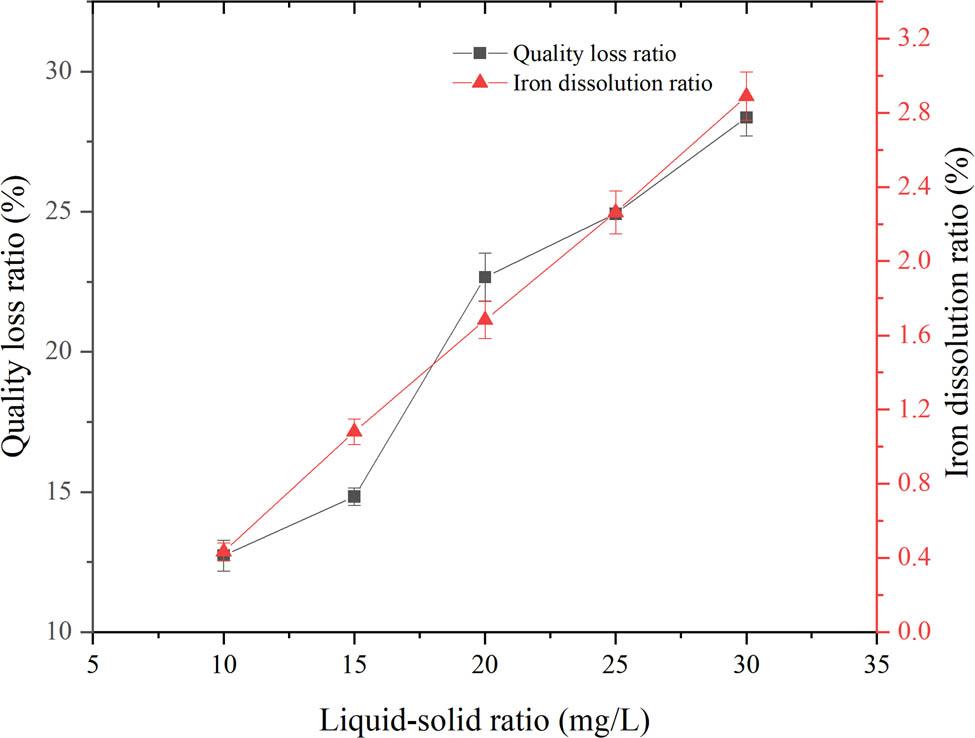 Relationship between liquid–solid ratio and dissolution rate of iron components.