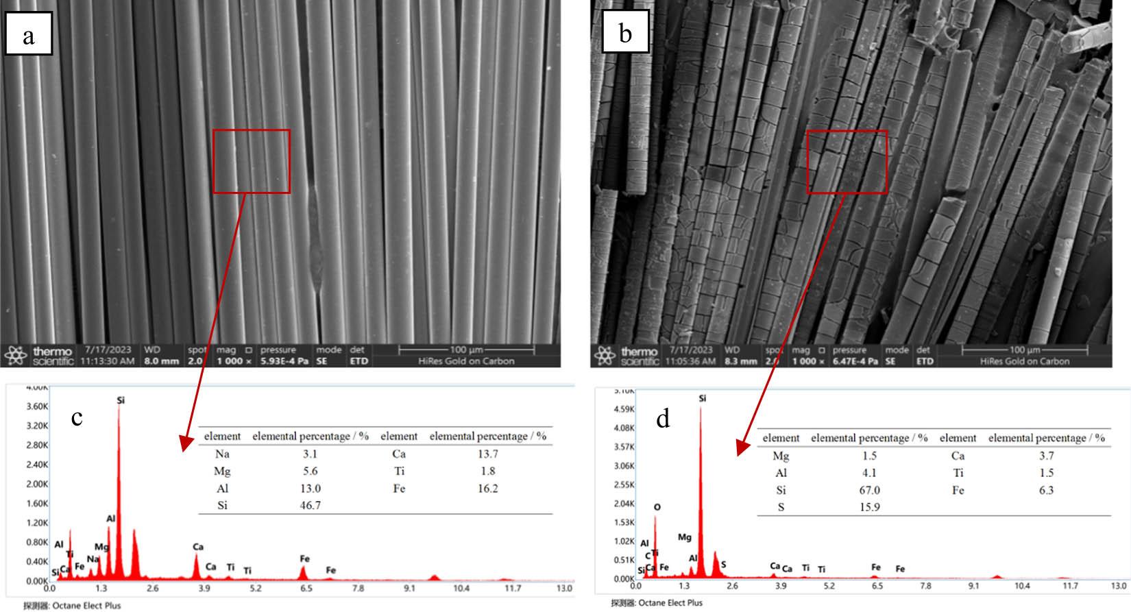 Morphological changes and micro-analysis results of basalt fiber before and after acid etching before acid etching, (b) after acid etching, (c) micro-analysis result of basalt fiber before acid etching, (d) micro-analysis result of basalt fiber after acid etching.