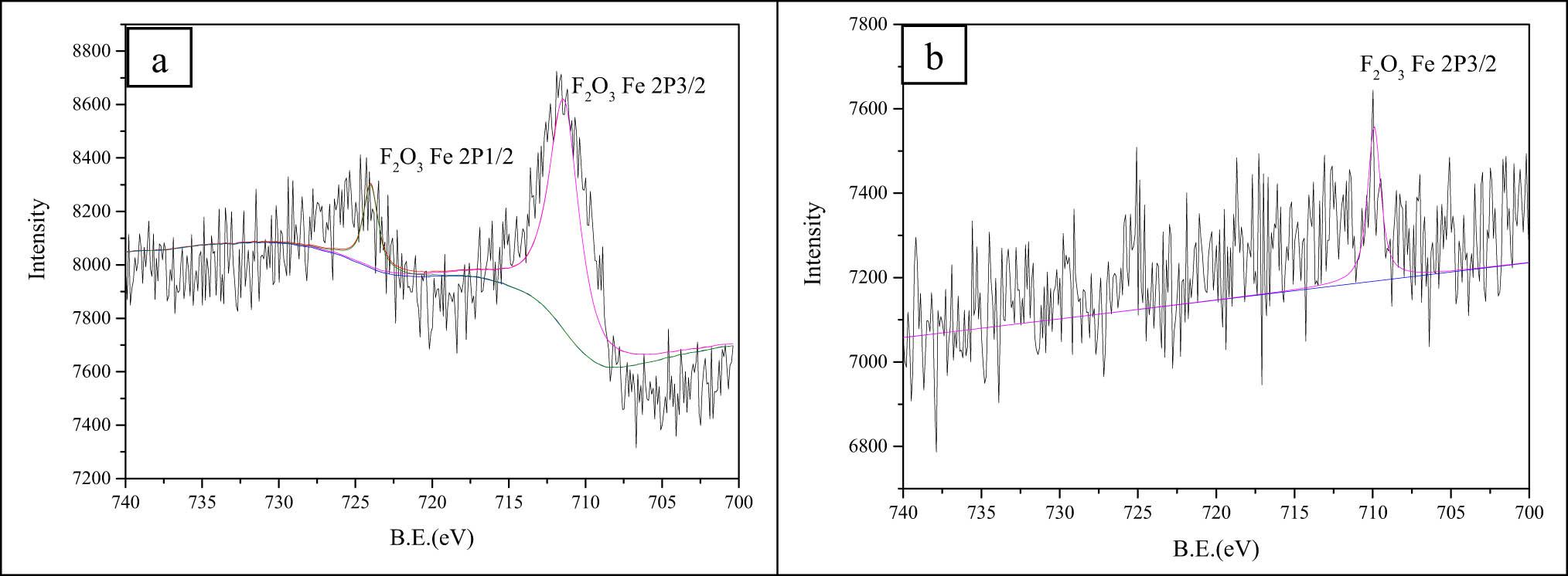 The surface elemental composition and chemical states of the basalt fiber before and after acid etching studied by XPS measurements are shown in Figure 8. It can be seen from Figure 8(a) that the iron component in the basalt fiber raw silk mainly exists in the form of Fe2O3. After dilute sulfuric acid etching, the iron component in the precursor is acidified, and the component in the form of Fe2O3 disappears (as shown in Figure 8(b)). However, the microzonation analysis results show that the iron fraction content remained 6.3%, revealing that there are other insoluble components of sulfuric acid co-existing with iron oxide in basalt fiber raw silk, such as iron atoms embedded in silicate lattices [31]. As reported in the reference literature, iron exhibits a dualistic influence on fiber mechanics: Elevated iron content in basalt glass lowers the crystallization activation energy during fiber formation, inducing spontaneous crystal nucleation that leads to surface defects and degrades tensile strength. Conversely, at optimal concentrations, iron serves as both network former and modifier. The resulting [FeO4] tetrahedra cross-link the silicate framework, enhancing structural stability while improving tensile performance [32,33]. Thus, the residual 6.3% iron primarily sustains fiber stability.