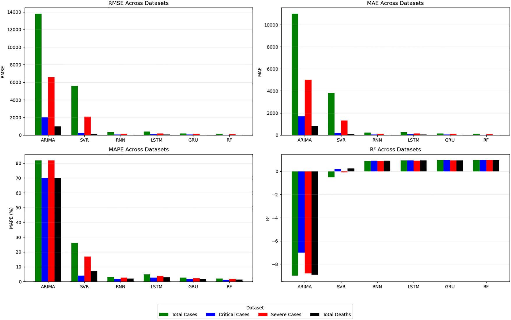 Performance metrics (RMSE, MAE, MAPE, and R 2 {R}^{2} ) for six models – ARIMA, SVR, RNN, LSTM, GRU, and RF – across four datasets: total cases, critical cases, severe cases, and total deaths