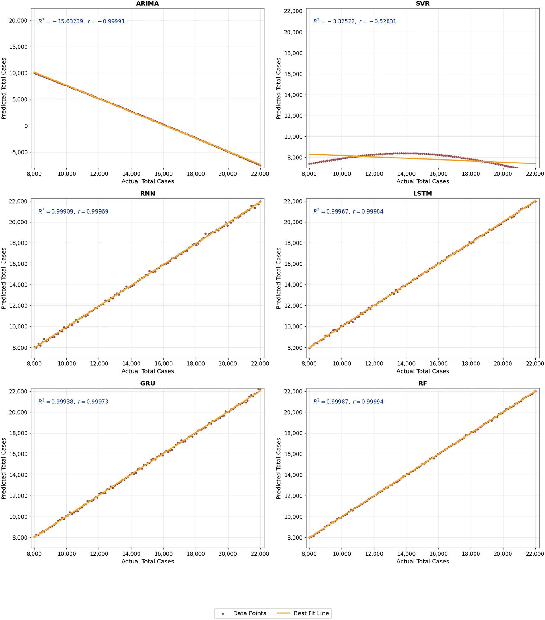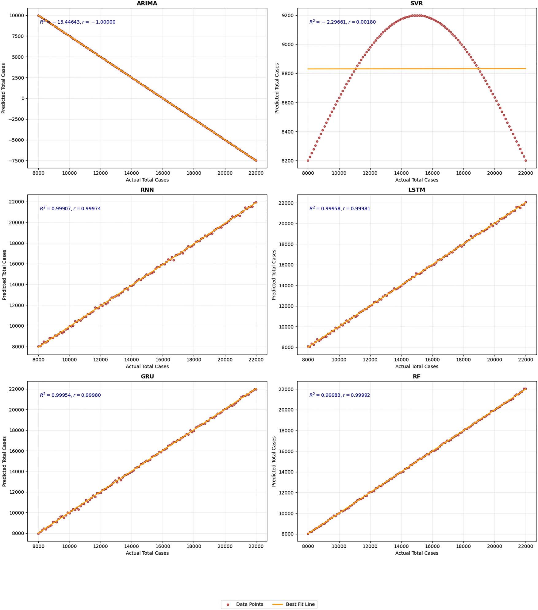 | Total cases | ARIMA | 13870.6770 | 10916.6357 | 82.0056 |