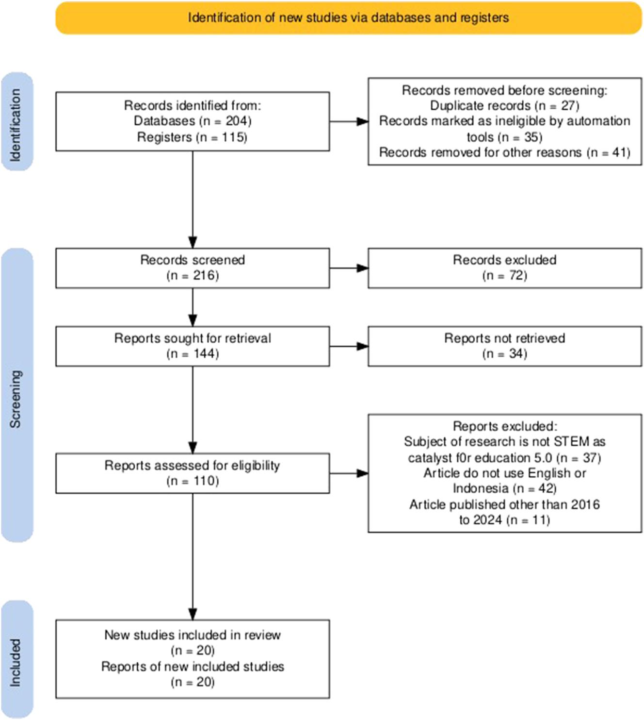 This research methodology is a literature review regularly designed to discover, assess, and integrate all pertinent, high-quality research material about a certain research question. The study commenced with the formulation of three research questions. We conducted a search for pertinent papers, screened and identified them, selected potential articles using the PRISMA diagram, performed qualitative analysis and synthesis of the findings, and concluded with a research report. We performed an extensive literature review in prominent electronic databases, such as Scopus, Web of Science, and Google Scholar. We picked publications from 2016 to 2024 to compile the latest findings. We performed a literature search using keywords including “STEM,” “education 5.0,” “learning,” “educational technology,” “educational innovation,” and “21st century.”