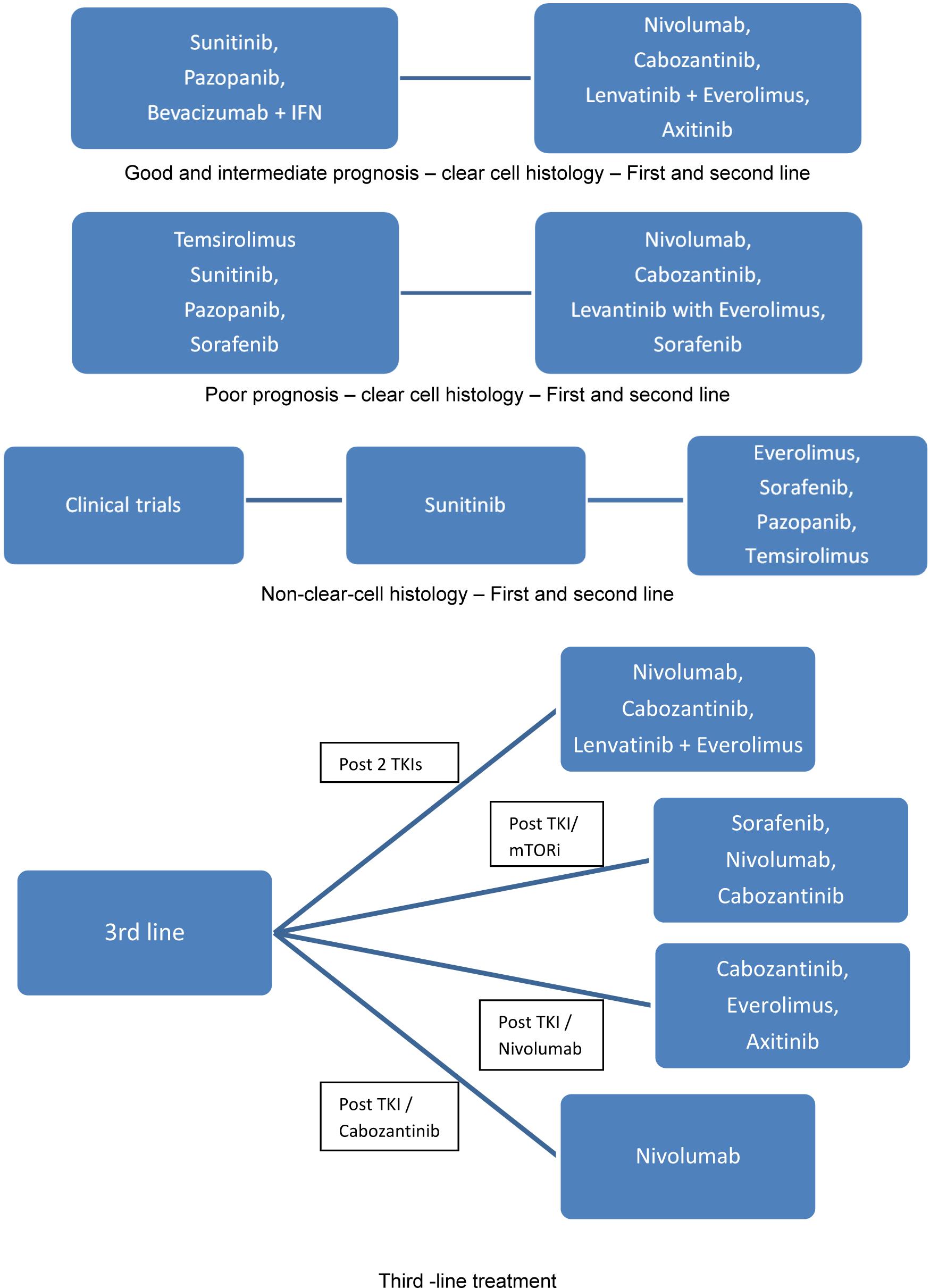 RCC systemic treatment has changed dramatically in the recent years. New agents targeting several pathways such as the VEGF or the mTOR pathways or inhibiting the interaction of the PD 1 receptor with its ligand have offered new efficient options in our therapeutic armamentarium. However, the respective CPGs/experts recommendations change continuously, thus making the selection of the appropriate therapy somewhat problematic, especially for community oncologists (9, 11).